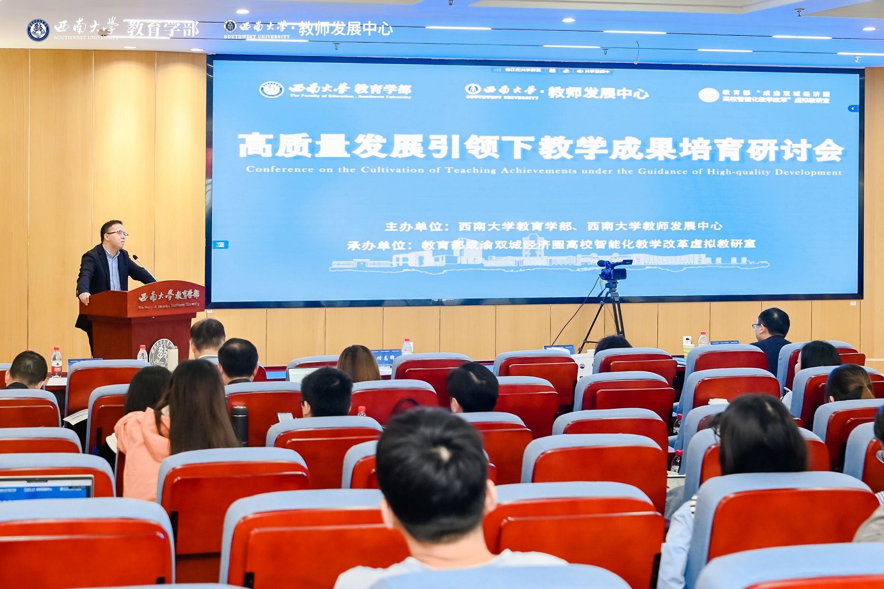 4月26日,由教育学部、教师发展中心主办,教育部成渝双城经济圈高校智能化教学改革虚拟教研室承办的“高质量发展引领下教学成果培育研讨会”在校顺利举行。研讨会以线上线下结合方式召开,学校党委副书记黄杰,重庆市教育委员会高等教育处副处长陈戈,特邀专家,教育学部和学校相关职能部门负责人出席会议,川渝两地30余所高校100余名代表参加研讨会,另有1000余人线上参会。