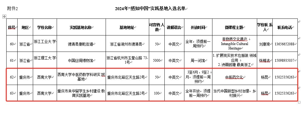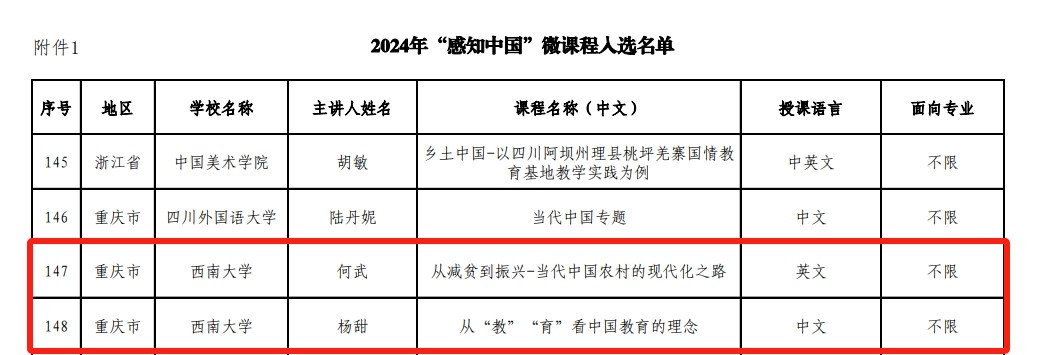 由何武教授主讲的课程“从减贫到振兴——当代中国农村的现代化之路”和杨甜副教授主讲的课程“从‘教’‘育’看中国教育的理念”成功入选国情教育微课程,“Beat365中文官方网站中医药教学科研实践基地”和“重庆市来华留学生乡村建设教育实践基地”成功获批“感知中国”社会实践基地。届时,入选的微课程将在“CSC人才在线”平台展播,获批基地将接纳市内外留学生开展国情教育及社会实践活动。