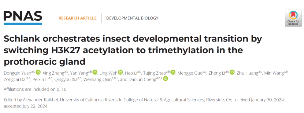 近日,Beat365中文官方网站前沿交叉学科研究院生物学研究中心程道军教授课题组在国际知名期刊《美国科学院院刊》(PNAS)在线发表了题为“转录因子Schlank通过介导前胸腺中H3K27乙酰化向甲基化修饰的转变调控昆虫变态发育”(Schlank orchestrates insect developmental transition by switching H3K27 acetylation to trimethylation in the prothoracic gland)的研究论文。该研究以家蚕和果蝇为模式,发现转录因子Schlank介导幼虫末龄阶段前胸腺细胞中发生组蛋白H3K27乙酰化修饰(H3K27ac)向三甲基化修饰(H3K27me3)转变,进而抑制保幼激素信号转导分子Hairy的转录,最终促进蜕皮激素合成与变态发育。该研究系统解析了H3K27修饰模式的变化调控昆虫发育转变的表观遗传机制。