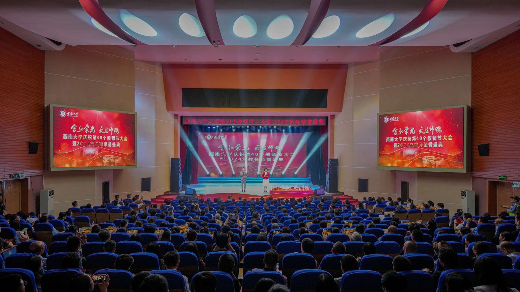 庆祝大会上,师生代表献上了主题诗朗诵、校史中的名师情景讲述、校友感怀视频、歌舞等节目,表达了对老师们深深的敬意和节日的祝福;讲述了西大名师名家育人故事,展现了广大教师立德树人、自信自强的精神风貌,鼓励老师们传承西大教育情怀。