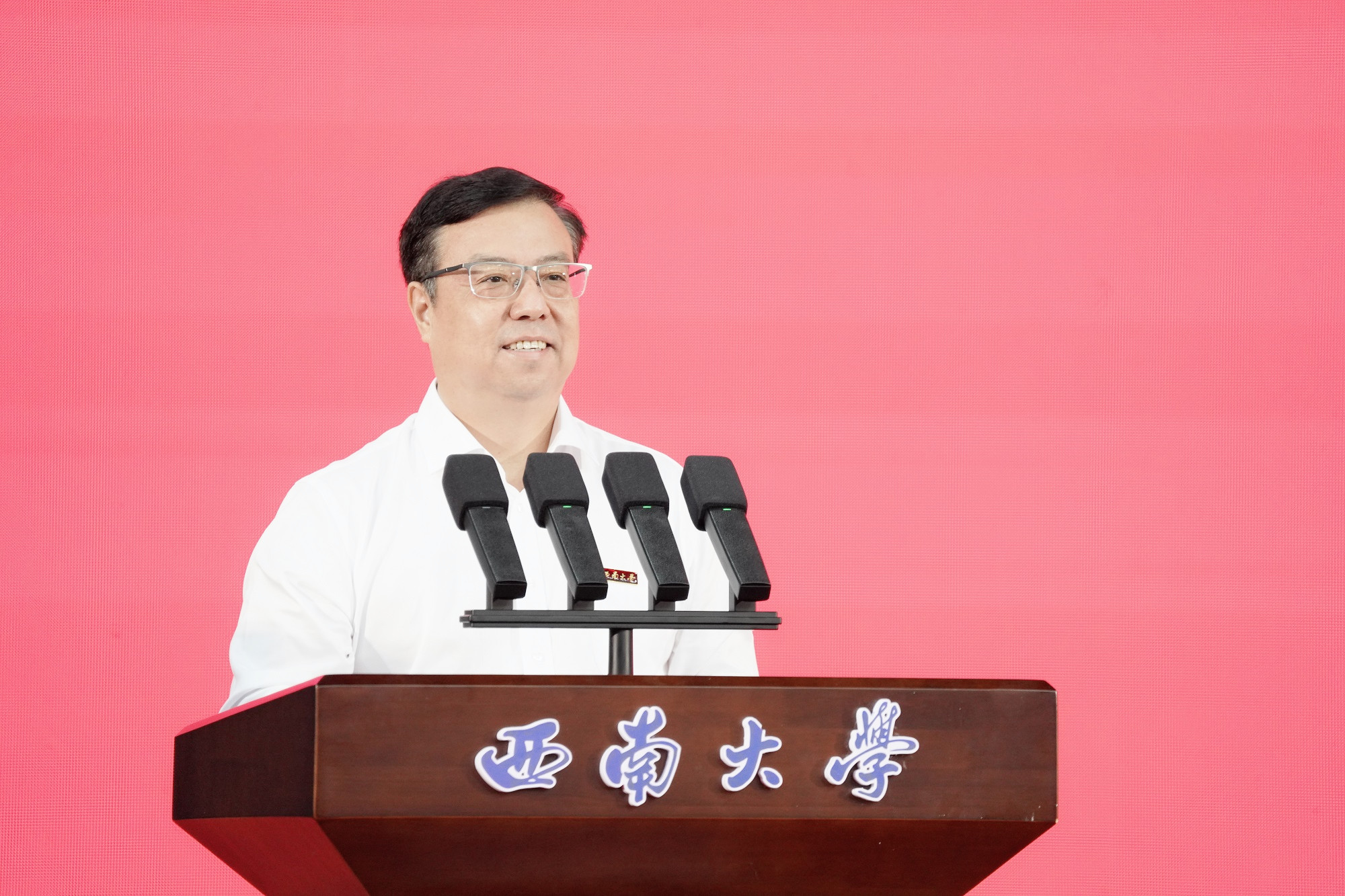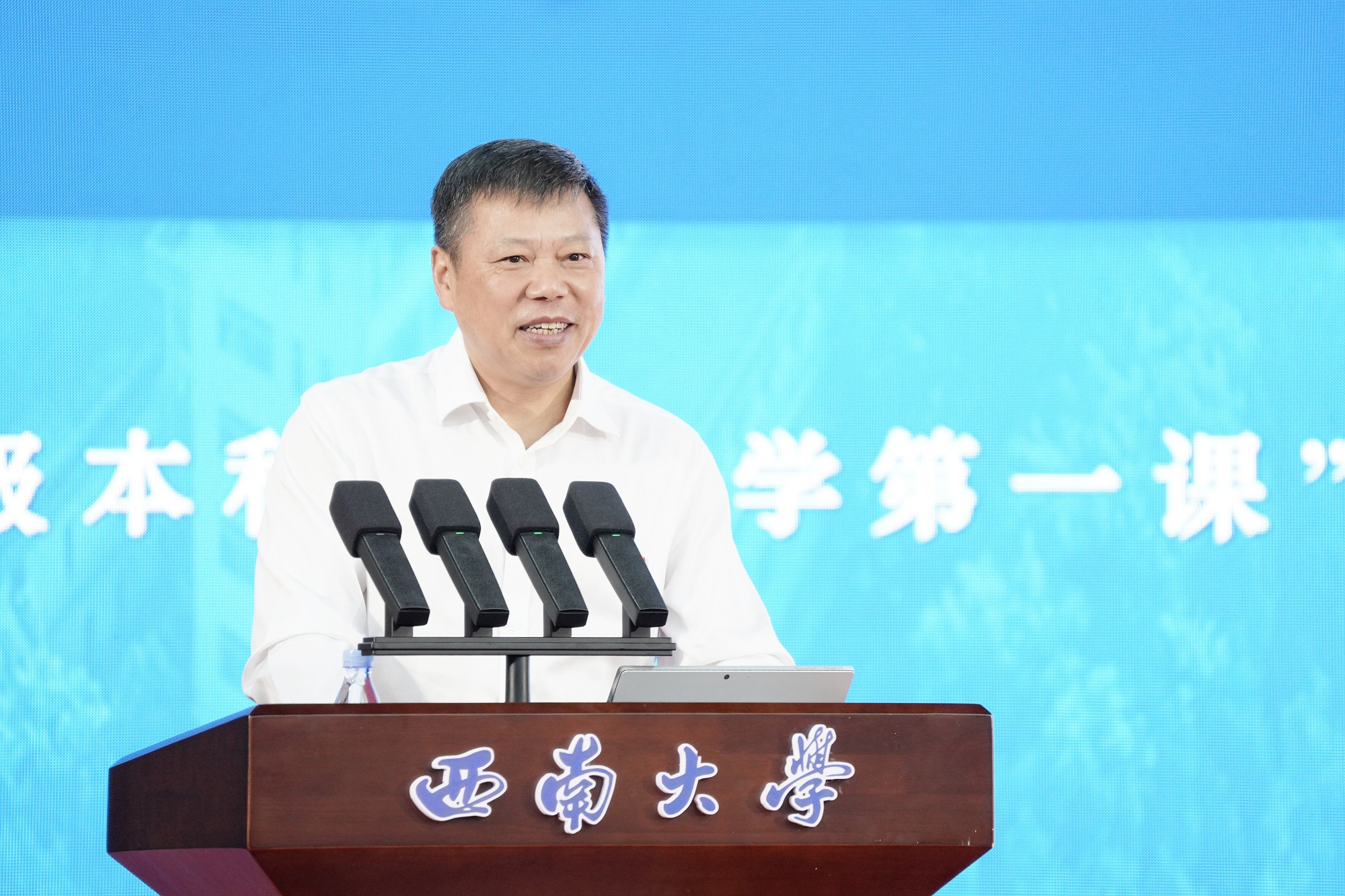 课上,张卫国回顾了学校在国家危难之际应势而生、在烽火岁月中艰苦创业、在新中国朝阳下茁壮成长、在改革开放新征程中勇毅前行、在新时代赶考路上奋楫扬帆的办学历程,结合118年来西大人励教兴邦、躬耕不辍的奋斗故事,阐释了大学精神的内涵,寄语青年学子要以史为镜、对话时代,博观约取、厚积薄发,行胜于言、知行合一。他强调,党的二十届三中全会对进一步全面深化改革、推进中国式现代化作出了系统性战略部署,为党和国家事业发展指明了方向,希望同学们要自觉接好接力棒,恪守“特立西南,学行天下”的大学精神,用奋斗为青春着色,用拼搏为时代注脚,让跃动的青春在为中国式现代化挺膺担当中绽放绚丽之花。