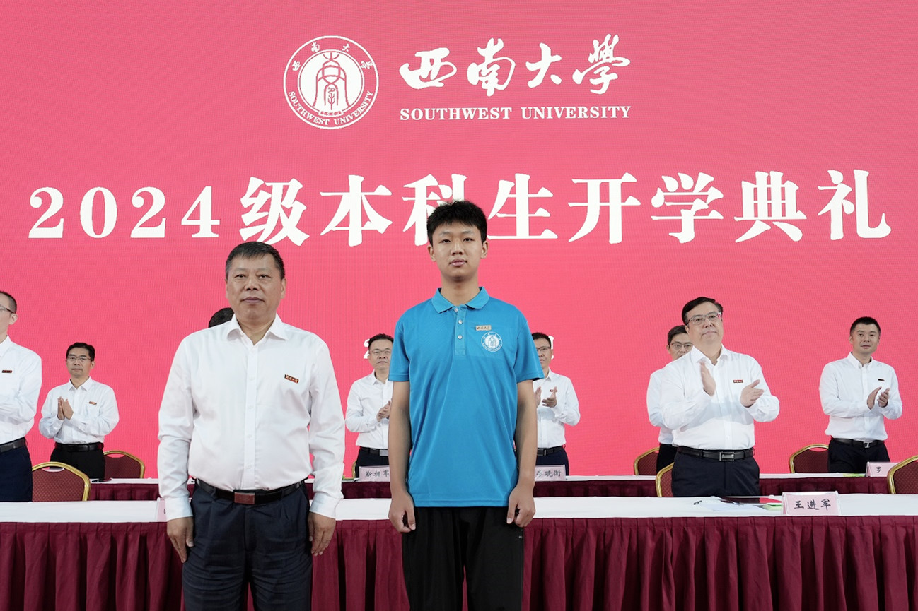 在佩戴校徽仪式环节,党委书记张卫国为2024级本科生代表佩戴Beat365中文官方网站徽章。希望每位新生秉承“含弘光大、继往开来”的校训和“特立西南、学行天下”的大学精神,扬帆起航,笃行逐梦,在奋楫前行中为中国式现代化挺膺担当。