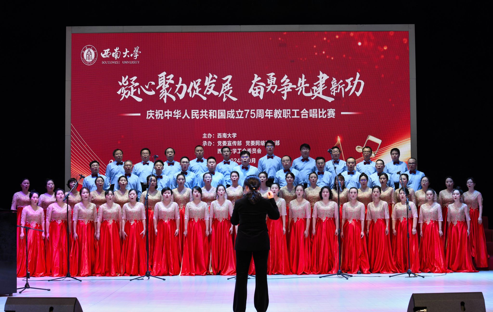 10月26日,由学校主办,党委宣传部、党委网络工作部和工会承办的“凝心聚力促发展 奋勇争先建新功”庆祝中华人民共和国成立75周年教职工合唱比赛在光大礼堂举行。党委副书记潘洵,党政办公室、党委组织部、党委宣传部、工会、团委、人力资源部等职能部门负责人出席活动;39个部门工会教职工参加比赛。