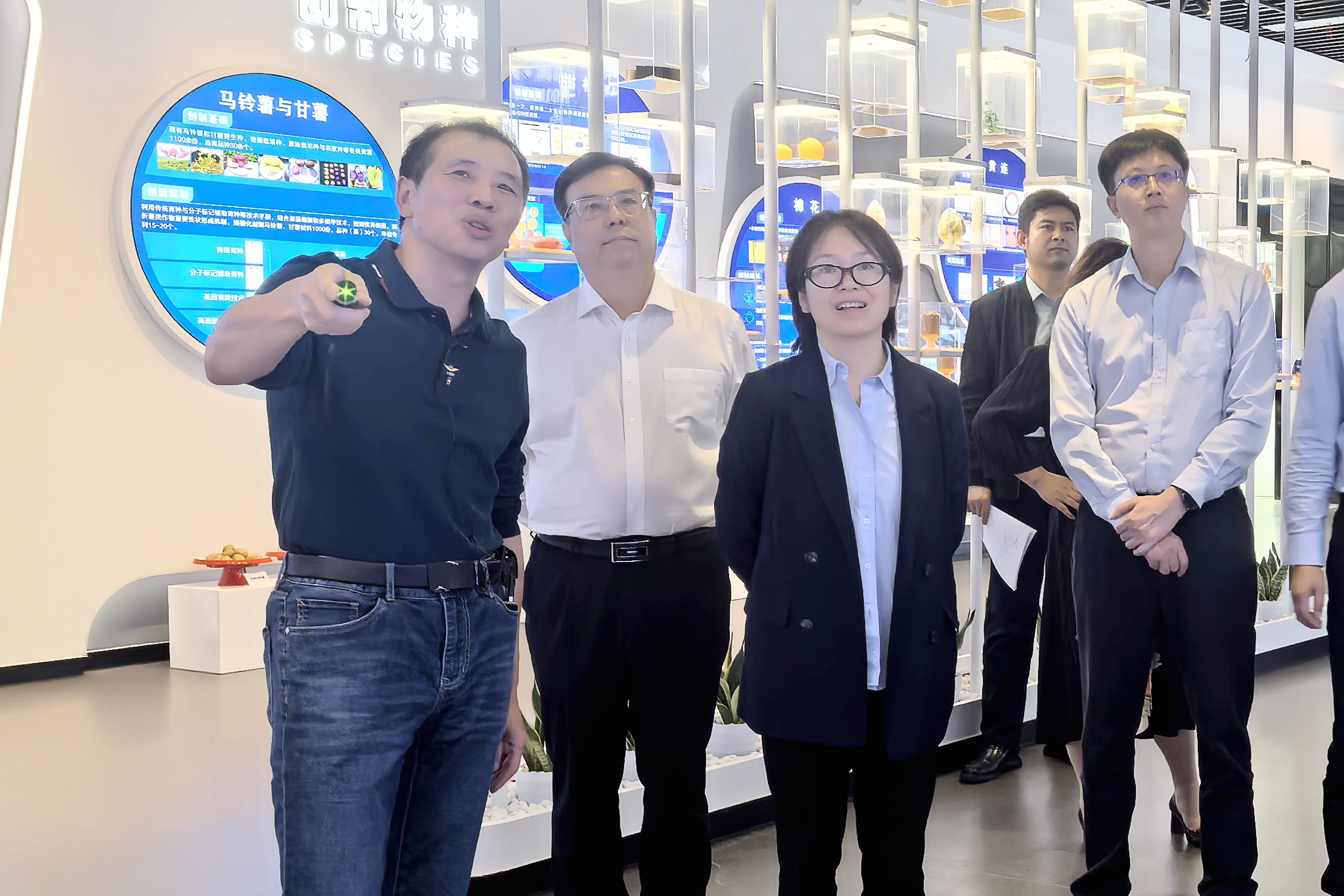 刘莉华一行首先参观了种质创制大科学中心展厅,详细听取中心首席科学家夏庆友教授关于中心战略定位、发展规划、关键技术攻关和研发进展等方面的汇报。在家蚕、水产、罗非鱼等物种创制区,刘莉华对各创制团队自主研发设施设备和工程化种质创制工作开展情况表示肯定,并与团队专家进行深入交流。在油菜和马铃薯创制区,团队负责人依次介绍了粮油作物油菜和马铃薯的创制攻关进程及推广应用现状,刘莉华边听讲解边询问细节,对已产出的阶段性成果给予赞许。