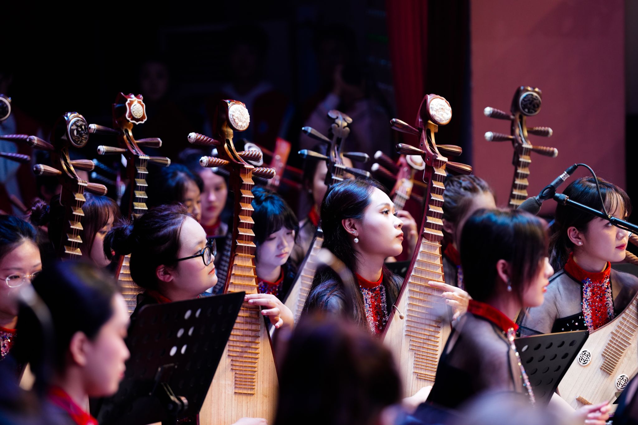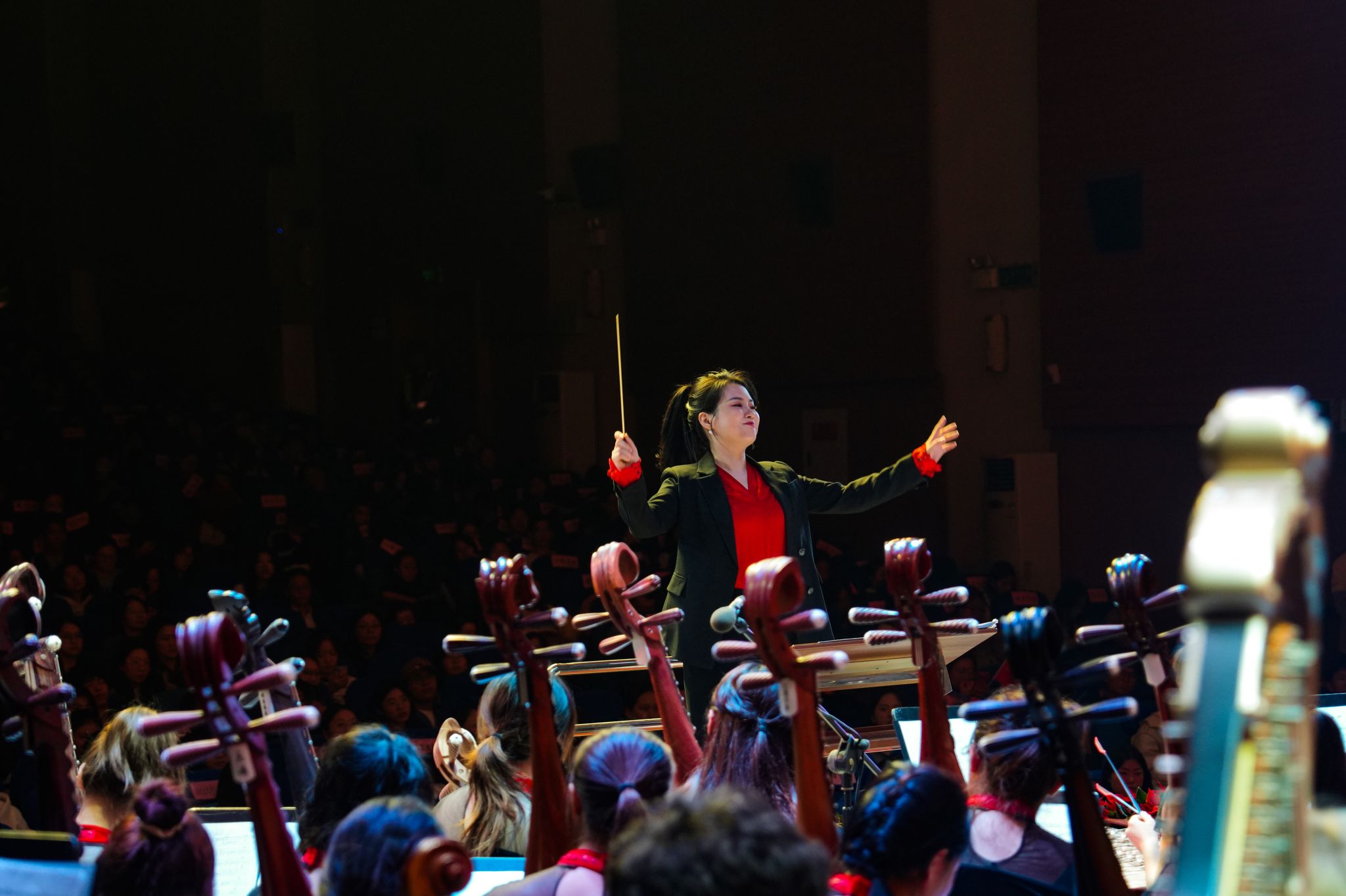 音乐会根植中华优秀传统文化,分为“映初心”“铸辉煌”“向未来”三个篇章。一首激昂的民族管弦乐《庆典序曲》拉开晚会序幕,欢快旋律似金风乍起,喜庆的氛围如繁花盛放,瞬间感染在场观众。