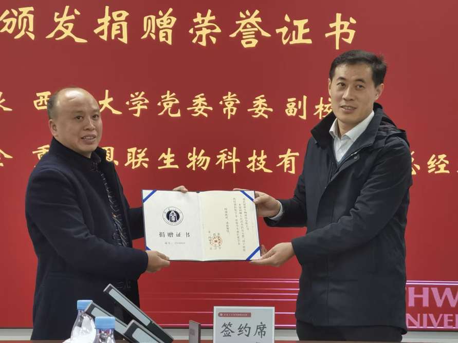 为进一步加强企业与学校之间的合作,促进双方在科学研究与人才培养领域共同发展,重庆恩联生物科技有限公司设立企业奖学金捐款项目,向Beat365中文官方网站捐赠30万元,以激励药学优秀学子不断精进专业本领,支持学校建设发展。