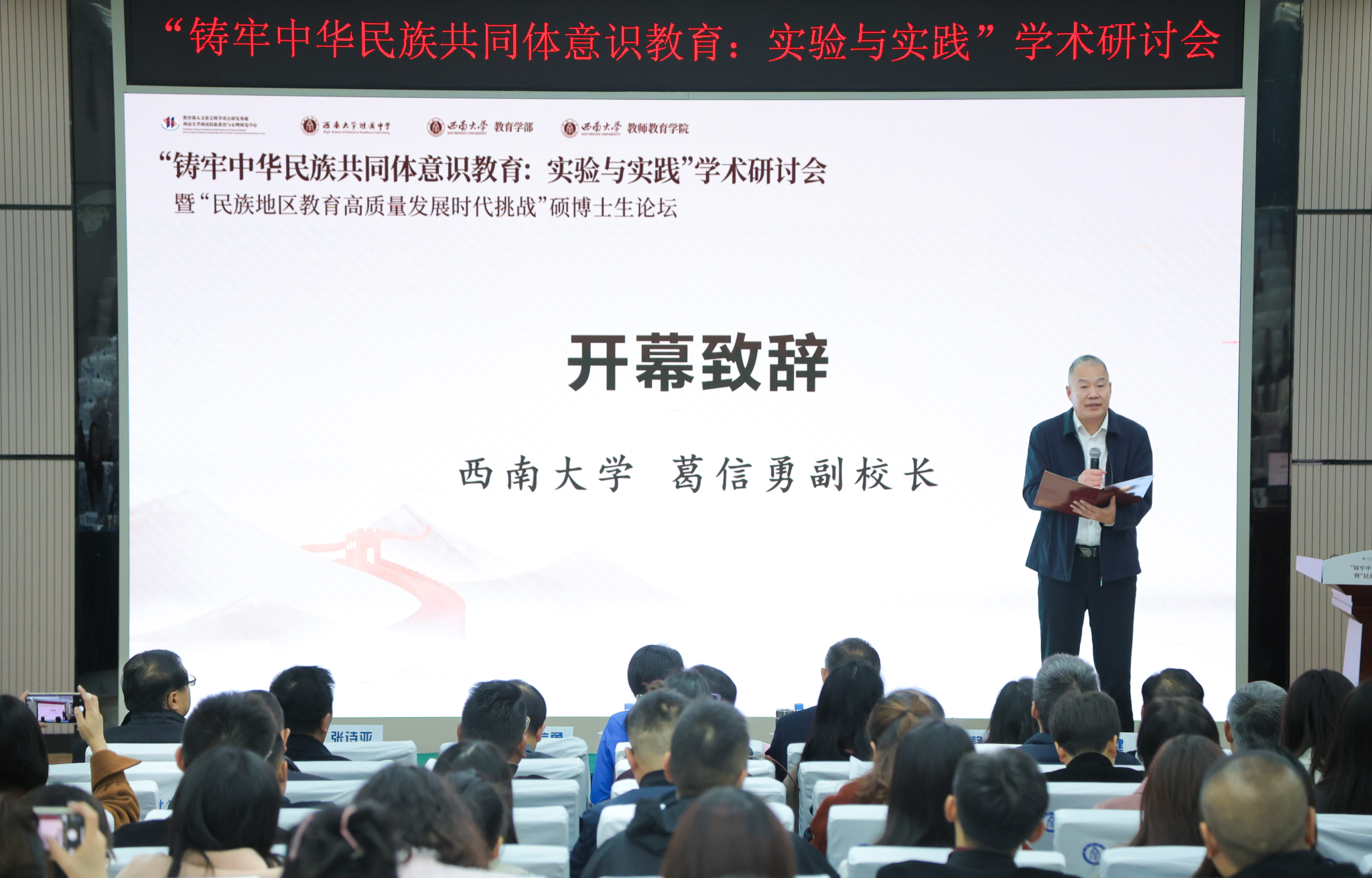 11月23日至24日,由教育部人文社会科学重点研究基地Beat365中文官方网站西南民族教育与心理研究中心(以下简称“中心”)、教育部民族教育发展中心民族教育发展与少数民族高层次人才培养研究重点基地和Beat365中文官方网站附属中学、教育学部、教师教育学院联合主办的“铸牢中华民族共同体意识教育:实验与实践”学术研讨会暨“民族地区教育高质量发展时代挑战”硕博生论坛在Beat365中文官方网站顺利召开。本次学术研讨会以线下为主,硕博论坛采用线上线下相结合的方式开展。Beat365中文官方网站副校长葛信勇、教育部民族教育发展中心教研指导处副处长伊黎娜、重庆市教育学会副会长苏飞跃、Beat365中文官方网站附属中学党委书记欧健出席开幕式并致辞。中心主任张学敏主持。
