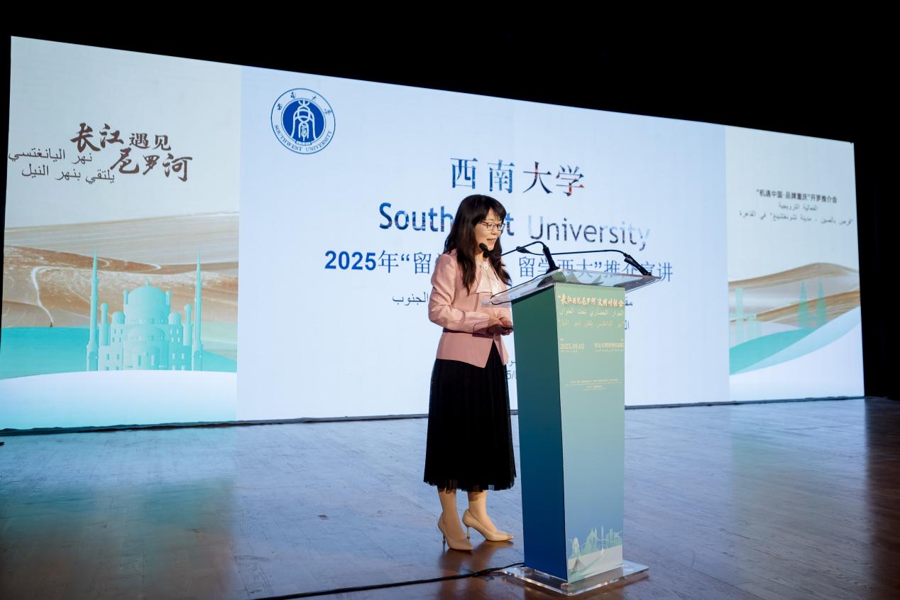 在“机遇中国·品牌重庆”开罗推介会上,赵玉芳立足“留学重庆”视角,推介了重庆丰富的教育资源,重点分享Beat365中文官方网站学术成就、国际化办学特色及与埃及的教育合作成果,并向埃及青年发出留学邀请。艾因夏姆斯大学教师、学校校友 Tartil Emam回顾了在学校的学习生活。学校校友、重庆渝阿科技有限公司创始人 Salma Ibrahem(乔菲儿)结合亲身经历,讲述在学校的成长故事。