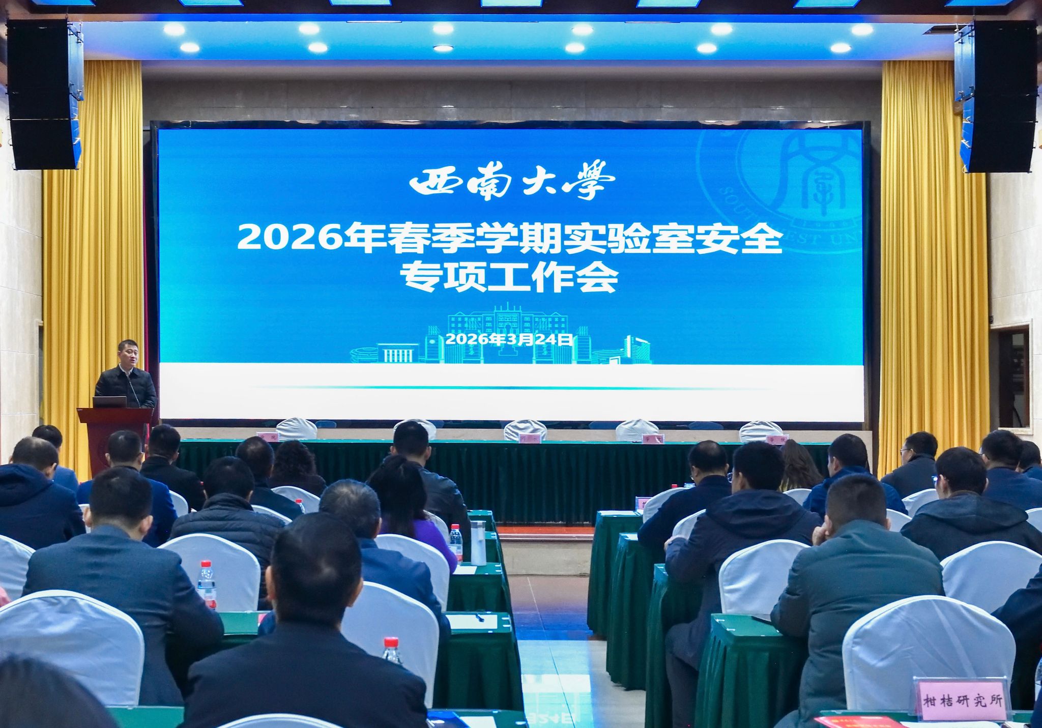 3月24日上午,学校在东方红会议厅召开2026年春季学期实验室安全专项工作会。副校长范大明出席会议,相关单位负责人参加会议。