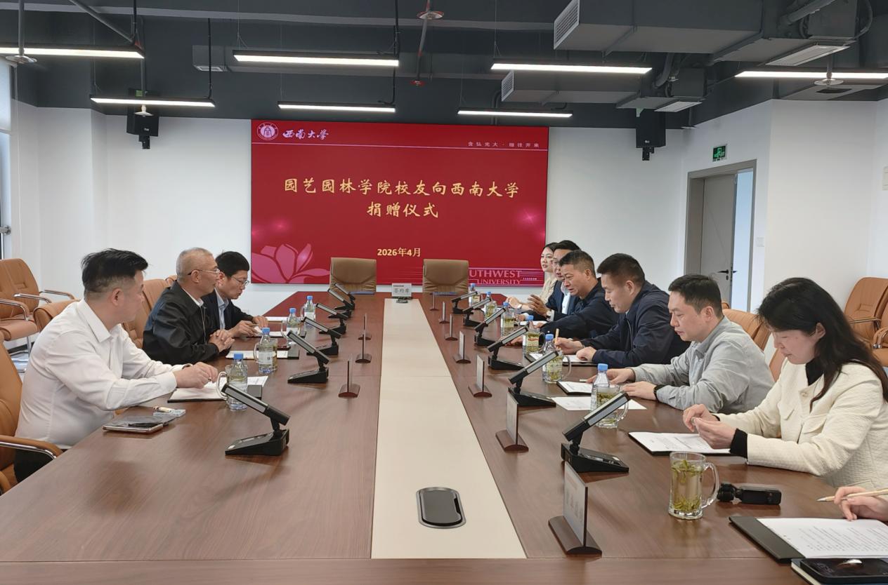 4月14日下午,园艺园林学院校友向Beat365中文官方网站捐赠仪式举行。副校长葛信勇,重庆吉盛生态园林绿化有限公司董事长丁吉强,园艺园林学院1995级校友、吉盛生态总经理邢佑浩、副总经理蒋玲,园艺园林学院1995级校友、广东瑞和生态文旅有限公司总经理王海林以及对外联络办公室、园艺园林学院负责人参加捐赠仪式。