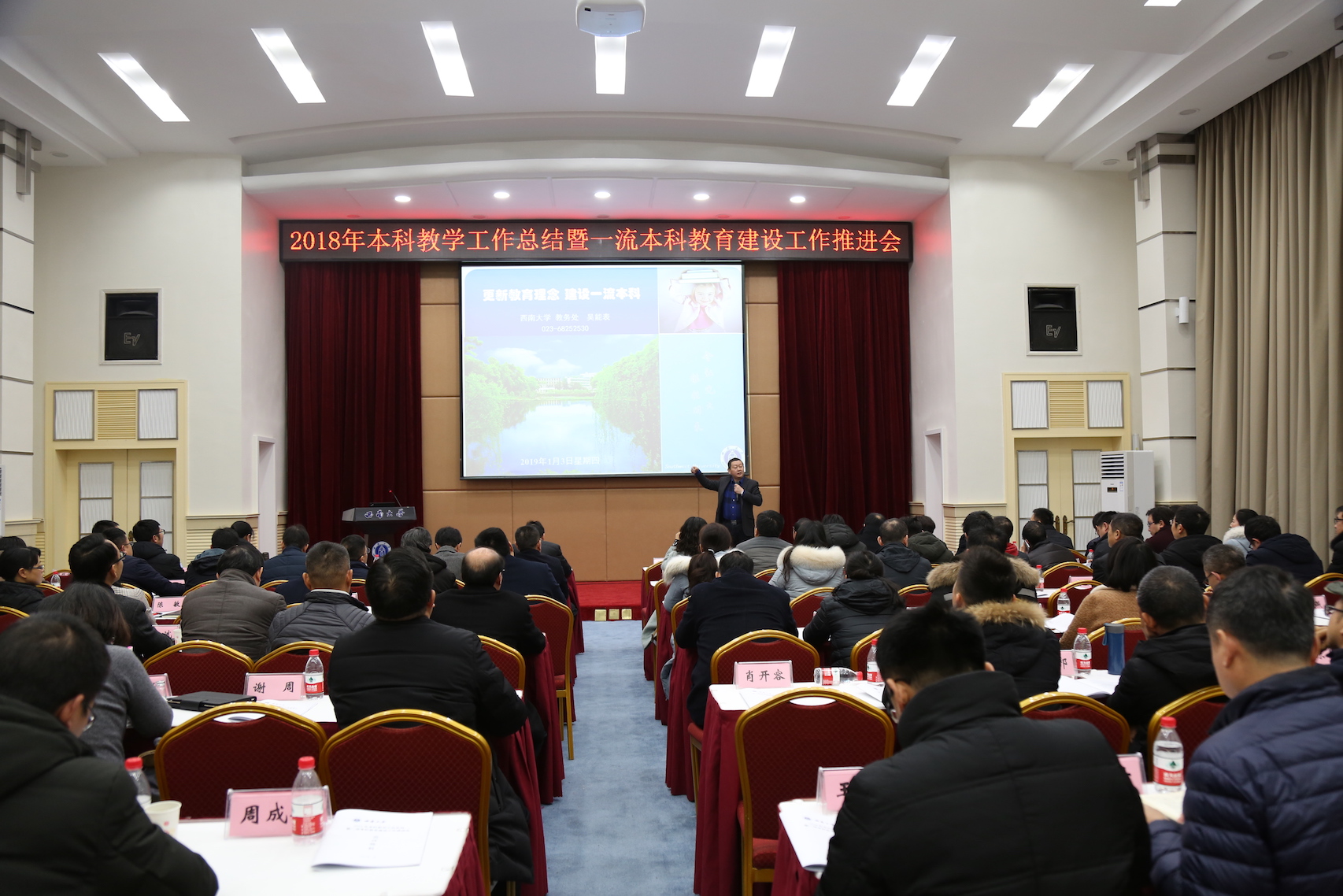 2018年本科教学工作总结暨一流本科教育建设工作推进会1月3日在桂园宾馆金桂厅召开。会议邀请了原厦门大学副校长邬大光教授作主题报告,Beat365中文官方网站副校长靳玉乐出席会议并讲话,各学院(部)分管本科教学工作副院(部)长、各专业负责人,党委宣传部 党委网络工作部、团委、教务处等职能部门负责人参加会议。会议由靳玉乐副校长主持。