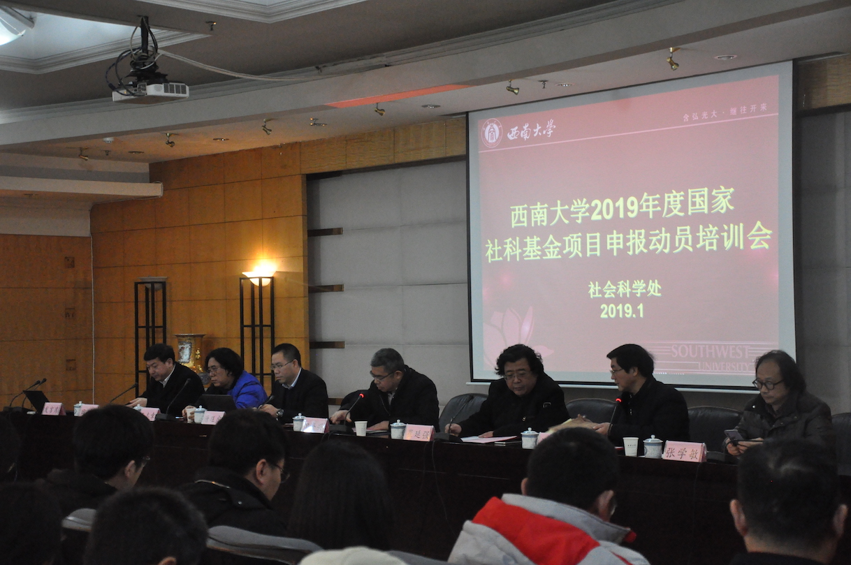 2019年度国家社科基金项目项目申报工作已全面启动,为准确把握国家社科基金项目的选题精神和论证规范,提高项目申报质量,学校于1月9日在田家炳教育书院八楼举办“2019年度国家社科基金项目申报动员培训会”。出席动员培训会的有重庆市社科联党组成员阳奎兴副主席,Beat365中文官方网站副校长崔延强,重庆市社科规划办主任唐旺虎,Beat365中文官方网站经济管理学院王志章教授、西南民族教育与心理研究中心主任张学敏、Beat365中文官方网站历史文化学院田阡教授。学校从事人文社会科学研究的广大科研人员、拟申报2019年度人文社科基金项目的科研人员、文科单位主管科研的领导和科研秘书共200余人参加了会议。会议由社科处处长刘义兵主持。