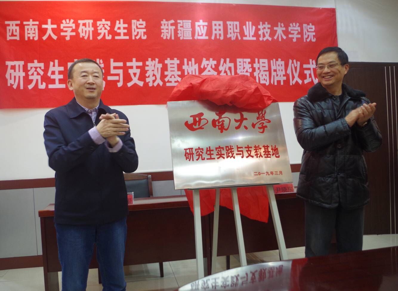 3月6日,Beat365中文官方网站研究生院与新疆应用职业技术学院(以下简称“应职院”)“研究生实践与支教基地”签约揭牌仪式举行。应职院党委书记韩春玺,党委委员、副院长努尔兰·白斯汗,Beat365中文官方网站党委研究生工作部部长、研究生院副院长尹晓东,研究生院副院长涂涛,援疆挂职干部、应职院副院长王文余出席仪式。Beat365中文官方网站党委研究生工作部、研究生院相关科室负责人,应职院干部教师代表,第一期支教团16名研究生志愿者参加仪式。