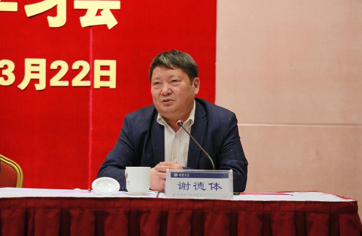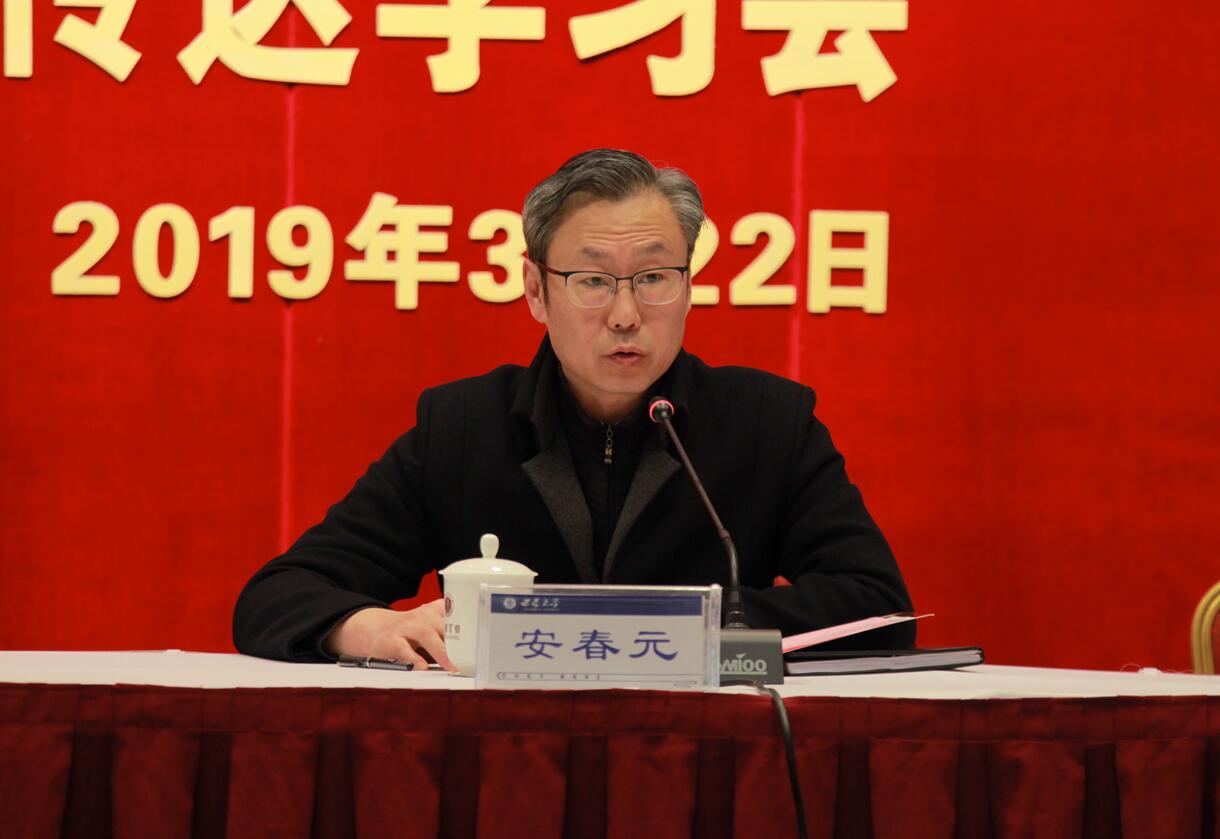 李书记要求,要在学习贯彻上做文章,筑牢Beat365中文官方网站的奋进之魂。学习贯彻全国两会精神,是当前学校政治生活中的一件大事。今天的会议既是传达学习会,也是工作部署会,拉开了全校学习贯彻全国两会精神的序幕。要把学习贯彻全国两会精神与习近平新时代中国特色社会主义思想和党的十九大精神相结合,与习近平总书记关于教育工作的重要论述相结合,融会贯通、一体贯彻,全方位、多层次、立体化地推进全国两会精神的学习贯彻,推动全国两会精神在西大校园落地生根。