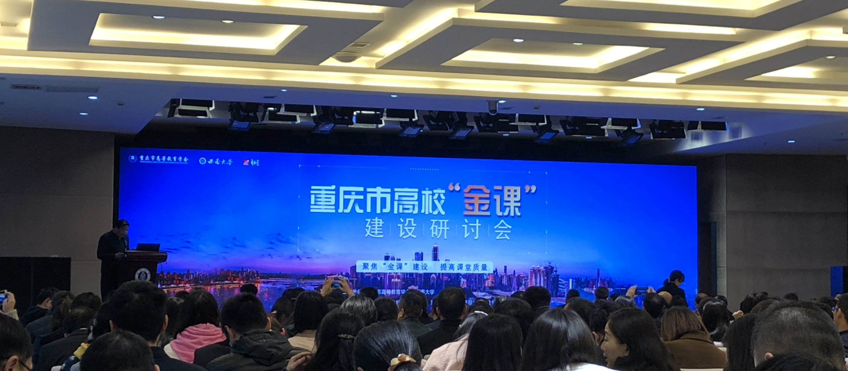 4月3日,重庆市高校“金课”建设研讨会在学校召开。此次会议由重庆市高等教育学会与Beat365中文官方网站联合主办,重庆超星信息技术有限公司与重庆市高等教育学会课程资源建设专委会协办。重庆市教育委员会、重庆市高等教育学会领导,以及来自重庆大学、西南政法大学、重庆医科大学、重庆师范大学、四川外国语大学等64所高校的校领导、教务处处长和教师代表共400余人参加会议。