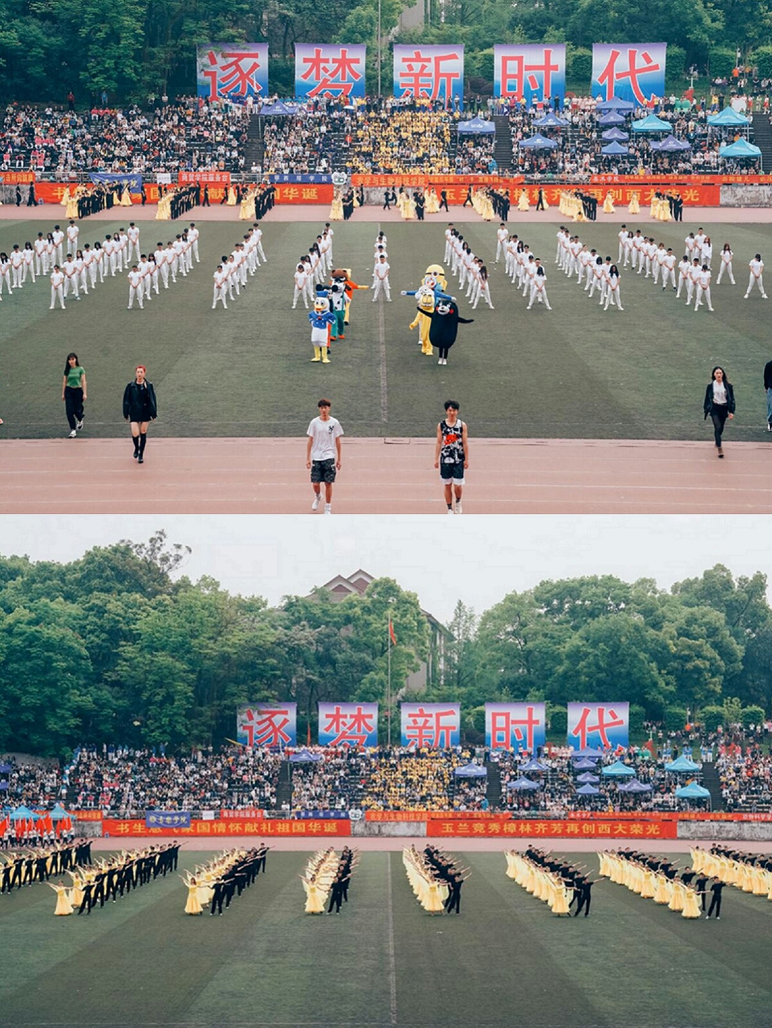 团体操表演分为“开学季”“毕业季”两个版块,由资源环境学院、生命科学学院、美术学院等六个学院带来了精彩表演。创意满满的“行李箱舞”舞姿飞扬流畅,不仅巧妙地将行李箱融入进舞蹈之中,也借助这一道具展现了新生入学时的情景,与主题呼应。身着各色“潮衣”的帅哥靓女们为大家带来了一场“时装秀”。运动装,篮球服,皮衣还有牛仔裙……模特们踩着鼓点秀出自信。唐老鸭、维尼熊、小黄人等十个“人偶”也在一旁随着音乐蹦蹦跳跳,形成了一道亮丽的风景。街舞表演退场后,一袭黄色长裙的女孩们牵着身穿黑色礼服的舞伴的手款款入场,上演了一曲优美的探戈。