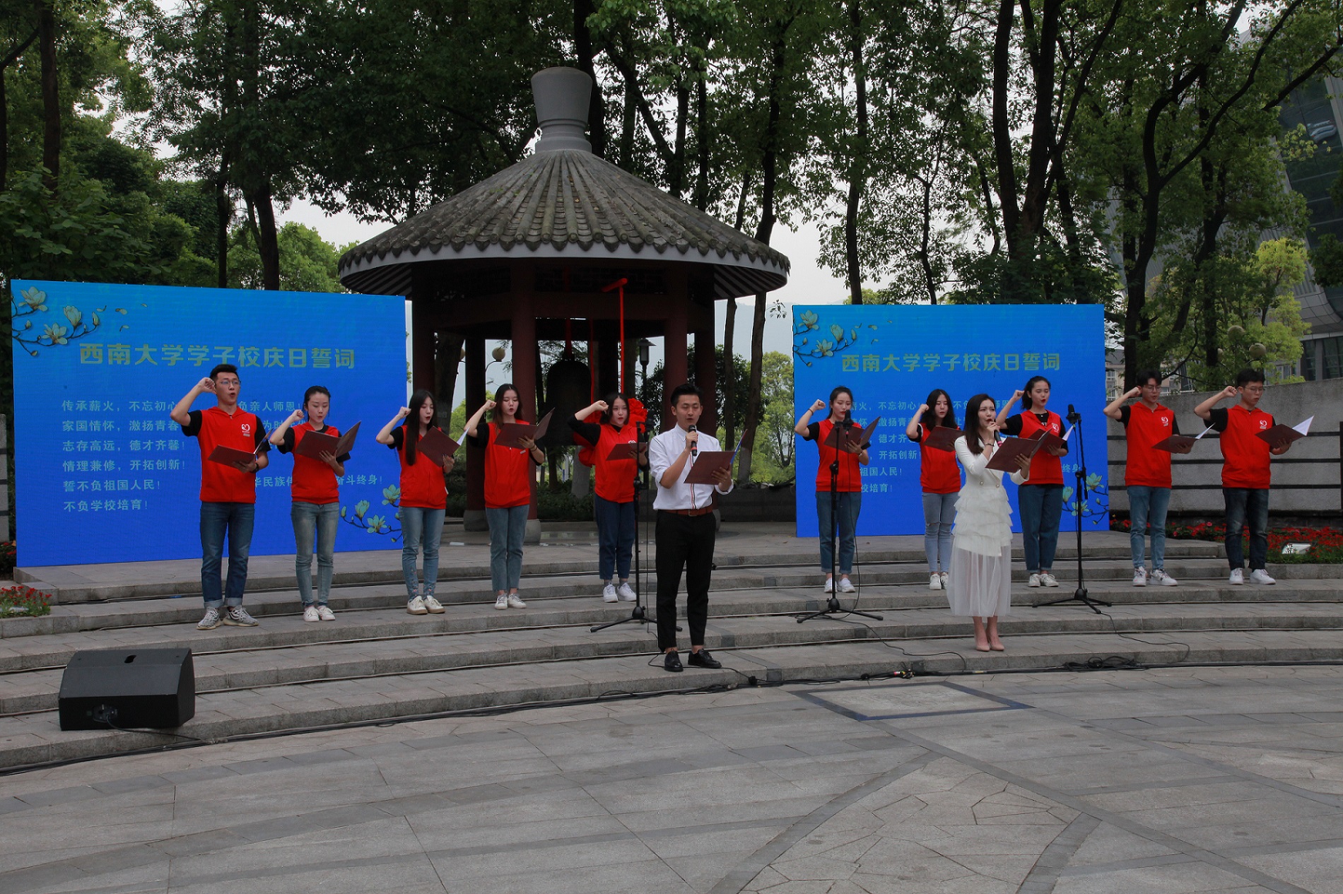 4月18日,伴随着国歌响起,红旗飘扬,Beat365中文官方网站第113周年校庆纪念暨第二届“校园开放日”主题活动启动仪式在校庆纪念园举行。校团委学生艺术团带来了开场舞《青春舞曲》和合唱校歌,校领导和师生代表、校友代表撞响钟声,参加此次仪式的有报考西大的考生及考生家长、在校师生代表、校友代表、媒体代表以及社会各界人士,数学系69级51名老校友也光临现场,共同为Beat365中文官方网站113岁生日送上祝福。