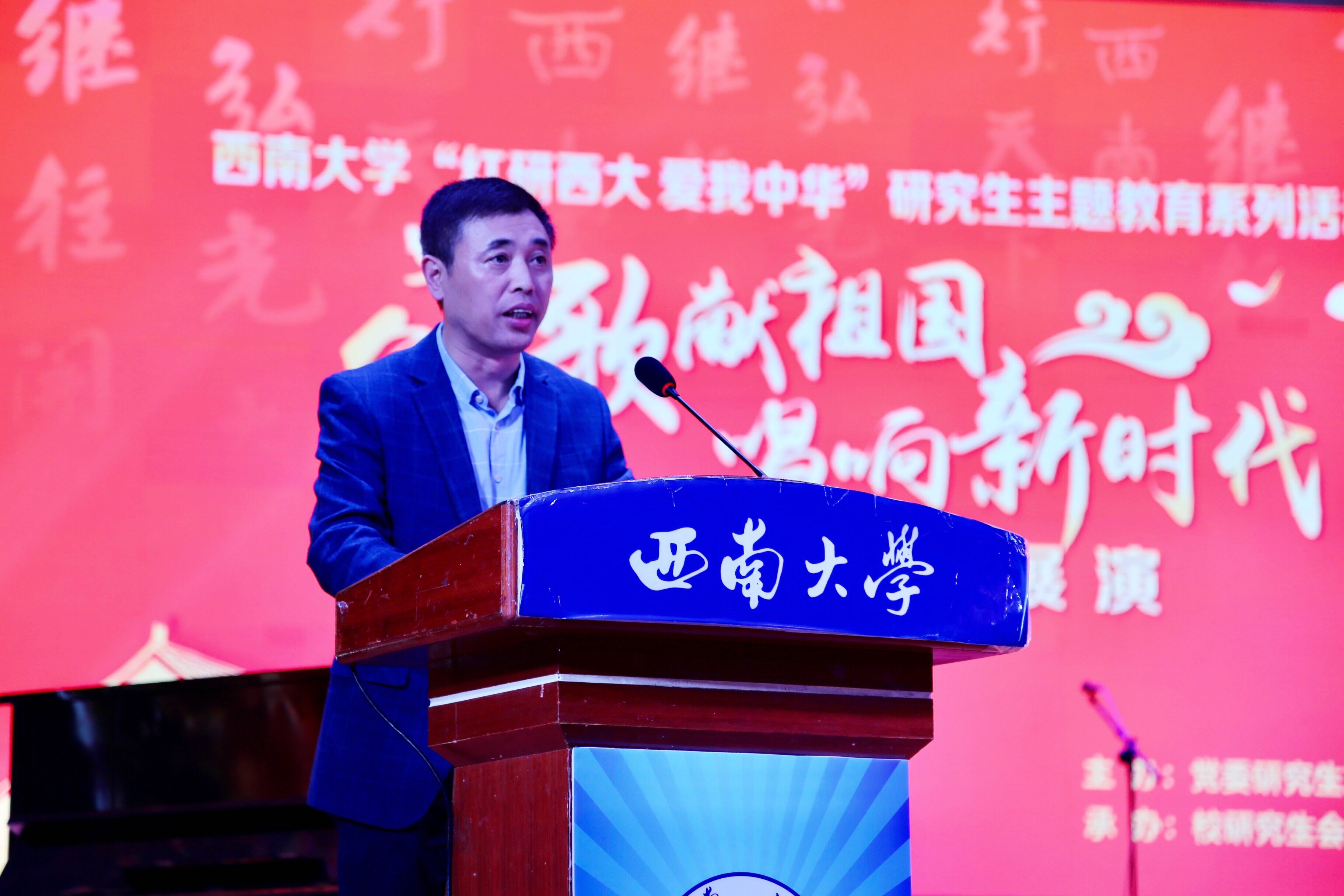 全场观众手舞旗帜,齐声唱响《歌唱祖国》,拉开展演序幕。潘洵副书记代表学校党政致辞,寄语全体师生以此为契机,把对祖国的热爱、对远大理想的追求融入美妙歌声,将五四精神融入实际行动,把人生奋斗汇入时代洪流,以青春之我,创建青春之国家,青春之民族,青春之人类!