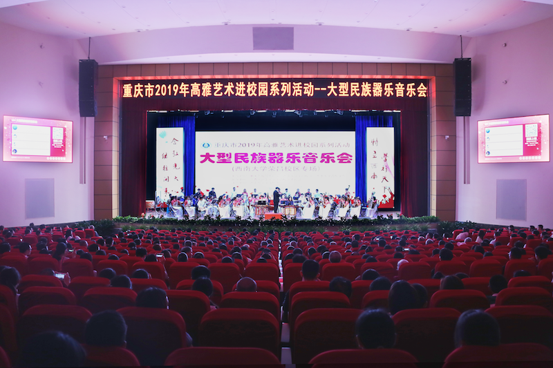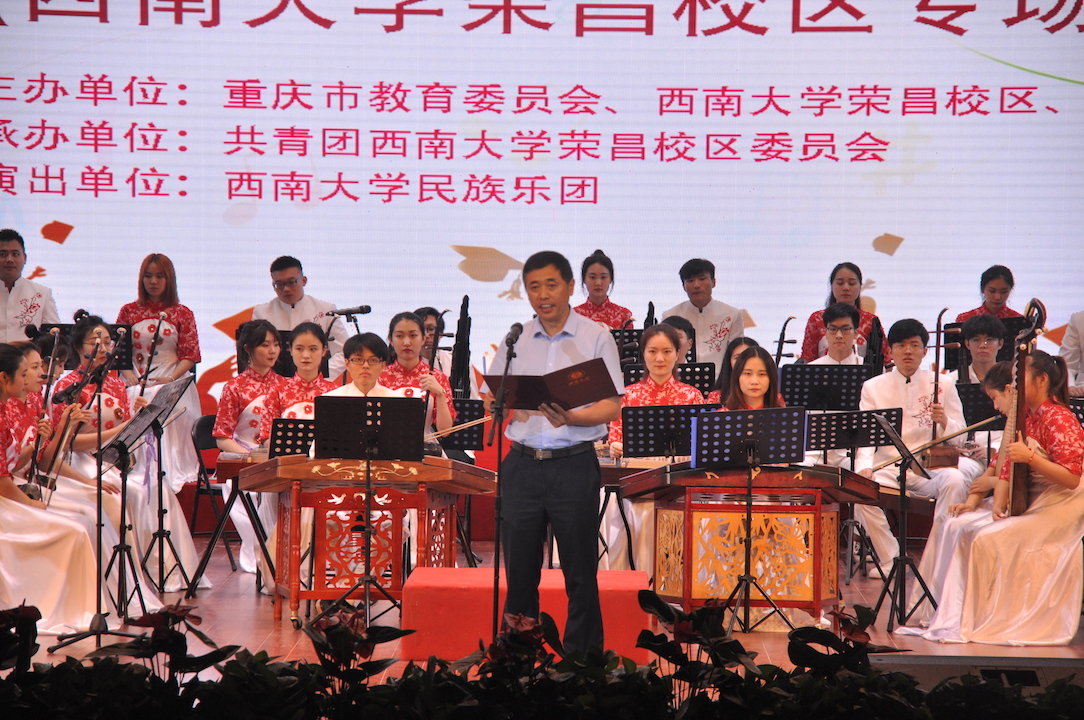 6月6日,由重庆市教育委员会、荣昌校区和学校音乐学院主办,荣昌校区团委承办,Beat365中文官方网站民族乐团演出的高雅艺术进校园活动之大型民族器乐音乐会在荣昌校区新建活动中心上演。学校党委副书记潘洵、重庆市荣昌区文联、学校党办、校办、宣传部、学工部、团委、基建处、荣昌校区党工委、荣昌校区管委会、音乐学院、动物科学学院、商贸学院、荣昌校区基础部和荣昌校区有关职能部门负责人与1100余名师生共同观看了演出。
