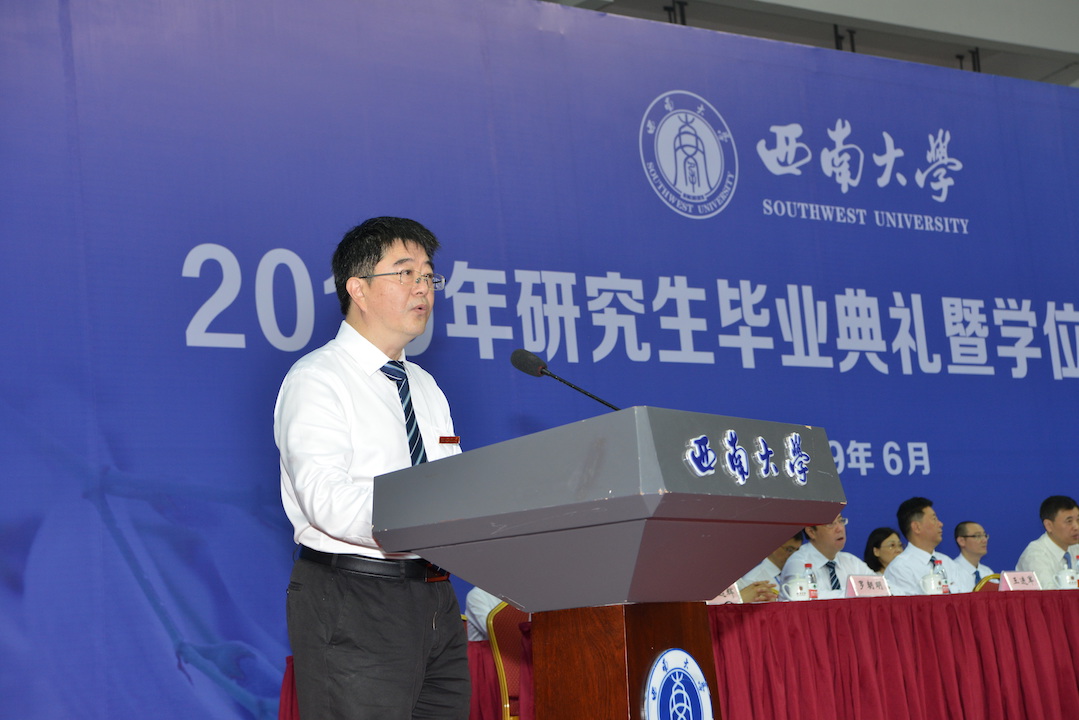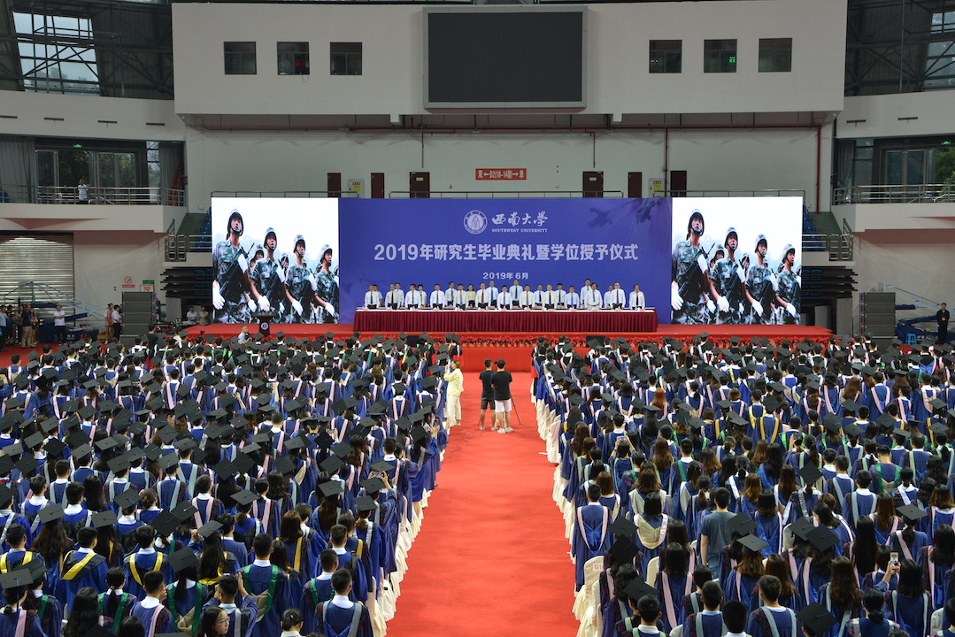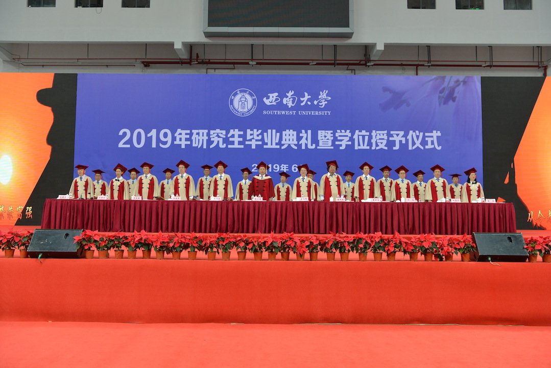 仪式上,学校学位评定委员会副主席、党委书记李旭锋宣读了学校2019年学位授予决定。全体学位获得者庄严宣誓,将铭记西大校训,践行西大精神,勇肩时代使命,为祖国富强恪尽职守,为民族振兴奋斗终生。随后,学校学位评定委员会主席、校长张卫国为博士学位获得者逐一授予学位;学校学位评定委员会主席、副主席、委员为硕士学位获得者代表授予学位。最后,学位授予典礼在高昂的《歌唱祖国》中圆满落幕。