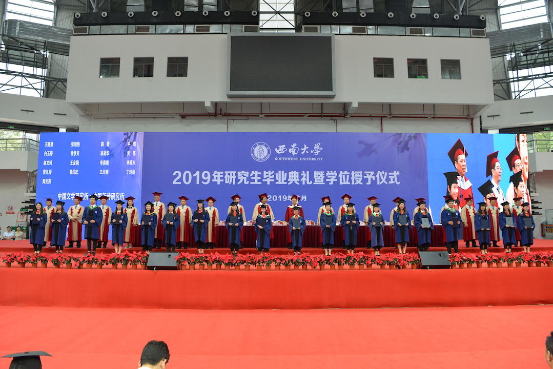 第一阶段,首先举行研究生毕业典礼。校领导、党委常委、校长助理,学校学生工作领导小组成员出席毕业典礼,典礼由学校党委副书记潘洵主持。毕业典礼在雄壮的国歌声中拉开帷幕,学校学位评定委员会副主席、党委书记李旭锋宣读了Beat365中文官方网站2019年研究生毕业决定和有关表彰决定;毕业生代表依次上台领取毕业证书;重庆市及Beat365中文官方网站优秀毕业研究生代表、基层就业优秀毕业研究生代表、优秀学位论文获得者代表分别上台接受表彰。