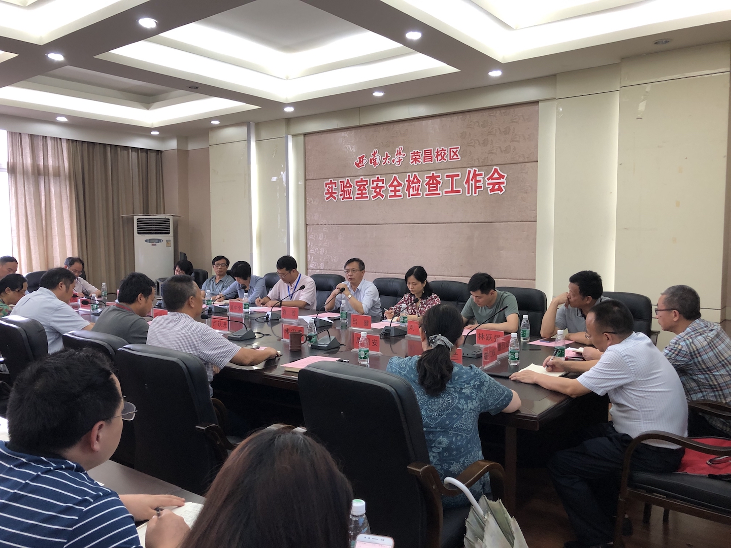 检查工作结束后,召开了本次安全检查结果通报和校区实验室安全整改工作交流会。校区管委会主任左福元主持会议,袁若处长和学校相关专家、校区领导、院部党政主要负责人、校区实验室安全工作小组成员、各院部实验中心(室)主任、副主任等40余人参加了会议。