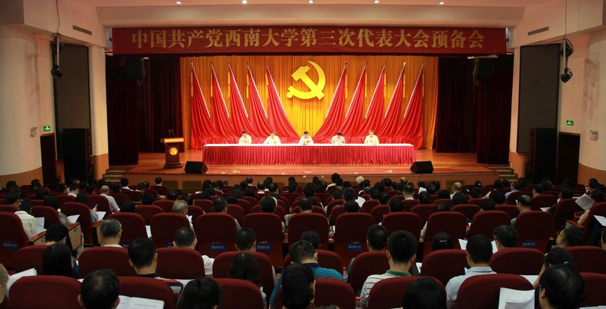 7月10日下午,中国共产党Beat365中文官方网站第三次代表大会预备会议在音乐学院演奏厅举行。党委书记李旭锋同志,党委副书记、校长张卫国同志,党委副书记安春元同志,党委副书记、纪委书记李华同志,党委副书记潘洵同志在主席台就坐,全体党代表参加会议。会议由李旭锋同志主持。
