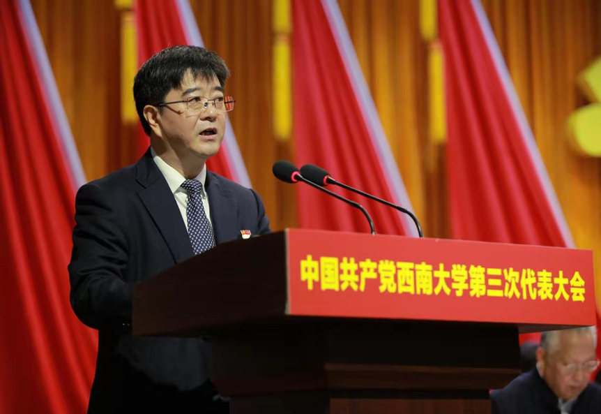 出席大会的上级领导和嘉宾有:教育部人事司副司长彭实,中共重庆市委教育工委书记、重庆市教委主任舒立春,中共重庆市北碚区委书记周旭,中共重庆市委组织部组织二处处长鲁学佳。在主席台就座的还有大会主席团全体成员和学校正职老领导、非中共党员校领导、院士、资深教授、全国人大代表等。出席大会的还有教育部人事司、市委组织部、市委教育工委和北碚区委有关部门负责同志。
