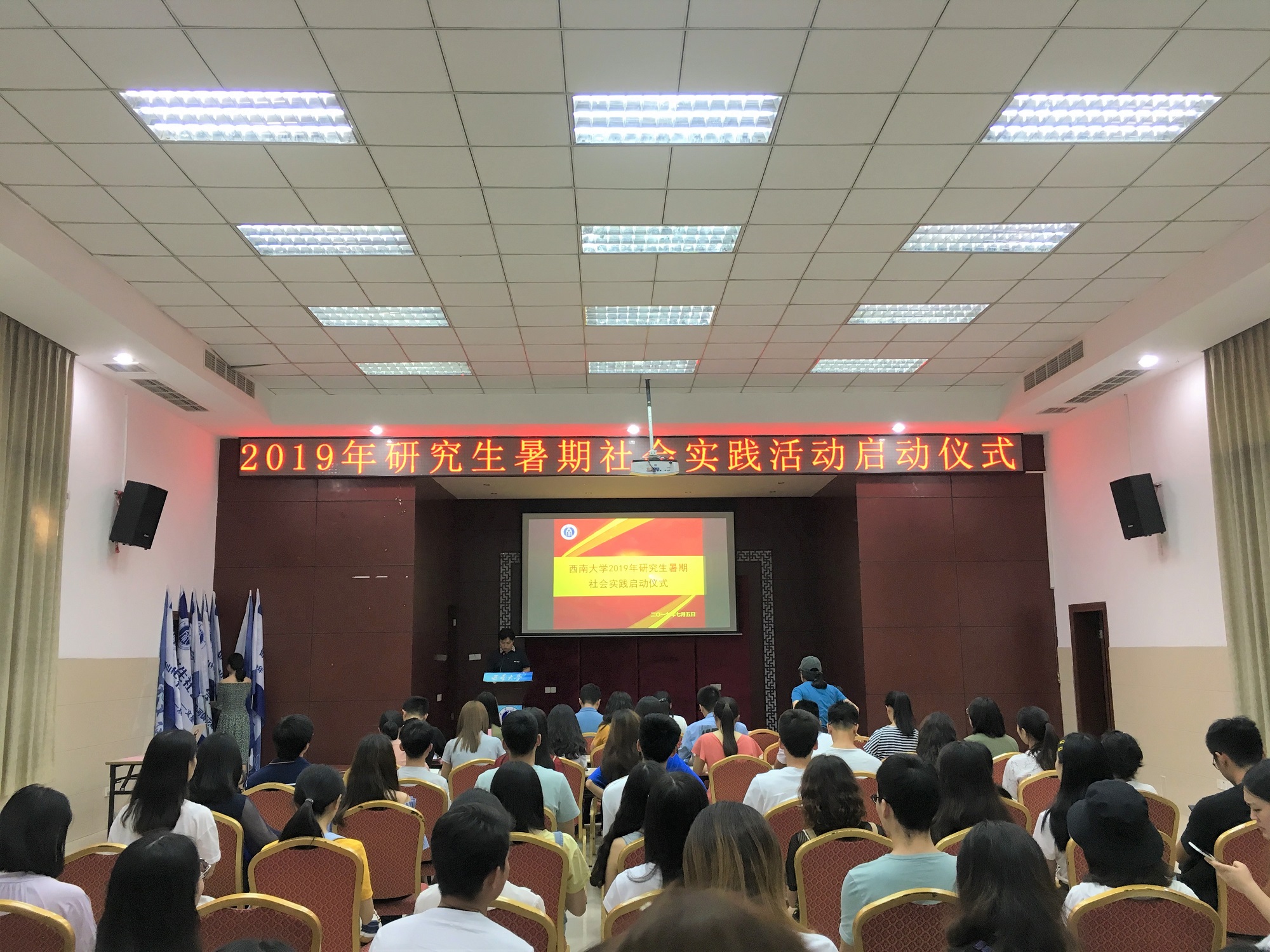 2019年暑期,学校党委研究生工作部将继续推进“百所山村小学计划”和“千百硕博进基层”工程,组织实践团队开展以“研行乡村梦起航,我与祖国共成长”为主题的社会实践活动。7月5日下午,2019年暑期研究生社会实践活动启动仪式在八一礼堂顺利举行。党委研究生工作部副部长胡娟、相关负责人以及各实践团队指导教师、校研会主席团、社会实践部同学、各实践团队代表参加启动仪式。
