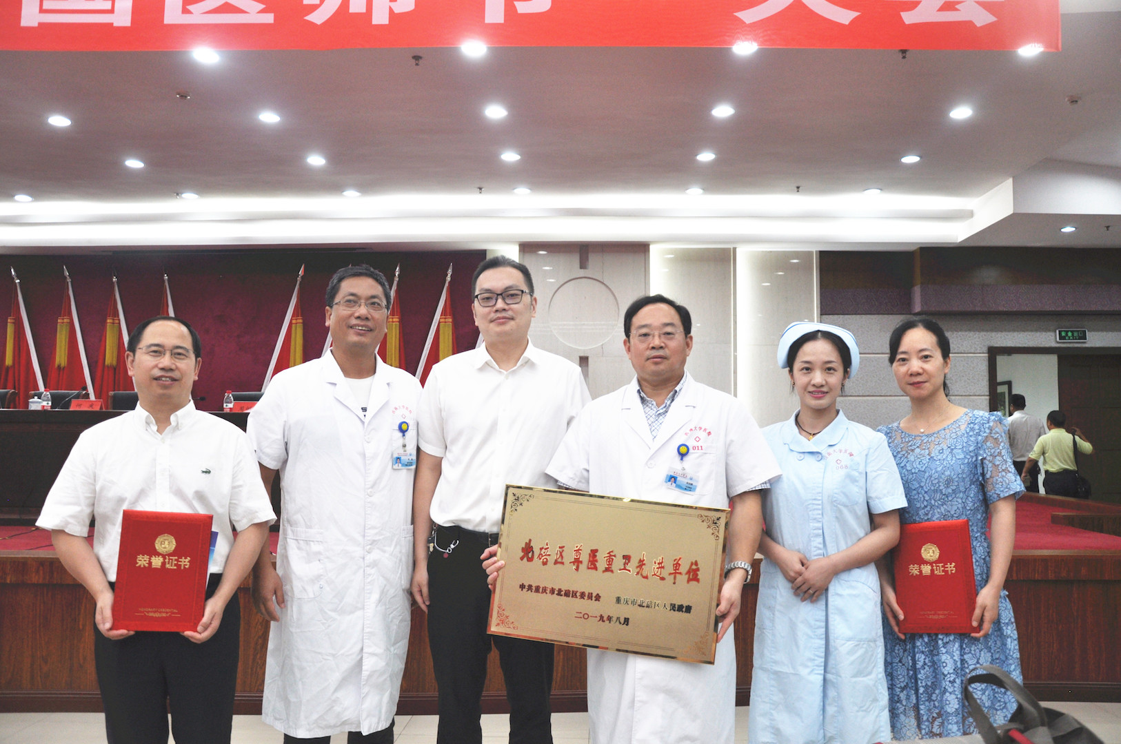 为营造尊医重卫氛围,同时迎接第二个“中国医师节”的到来,8月19日,北碚区开展了尊医重卫先进集体、十佳医务工作者、优秀家庭医师、优秀乡村医师评选表彰工作,学校副校长温涛出席此次表彰大会。学校荣获“尊医重卫先进集体”称号、校医院康复一科护士长石海燕获“十佳医务工作者”称号、内二科主任李万甫获“优秀家庭医师”称号。