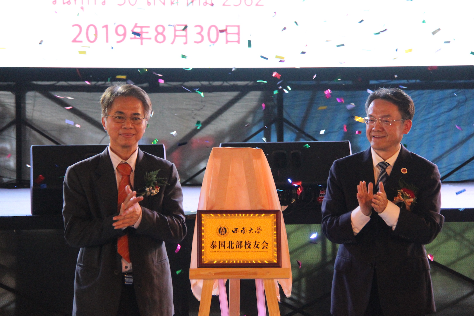 8月30日,学校泰国北部校友会在泰国孔敬大学举行揭牌仪式。中国驻孔敬总领馆总领事廖俊云、中国驻泰王国大使馆一等秘书宋若云、孔敬府副府尹汕迪、孔敬大学副校长密楚等出席揭牌仪式,并对泰北校友会的成立表示祝贺,对学校多年来为泰东北乃至整个泰国培养高水平汉语人才做出的贡献表示感谢。学校国际学院党总支书记刘猛及对外联络部相关负责人代表学校出席揭牌仪式。