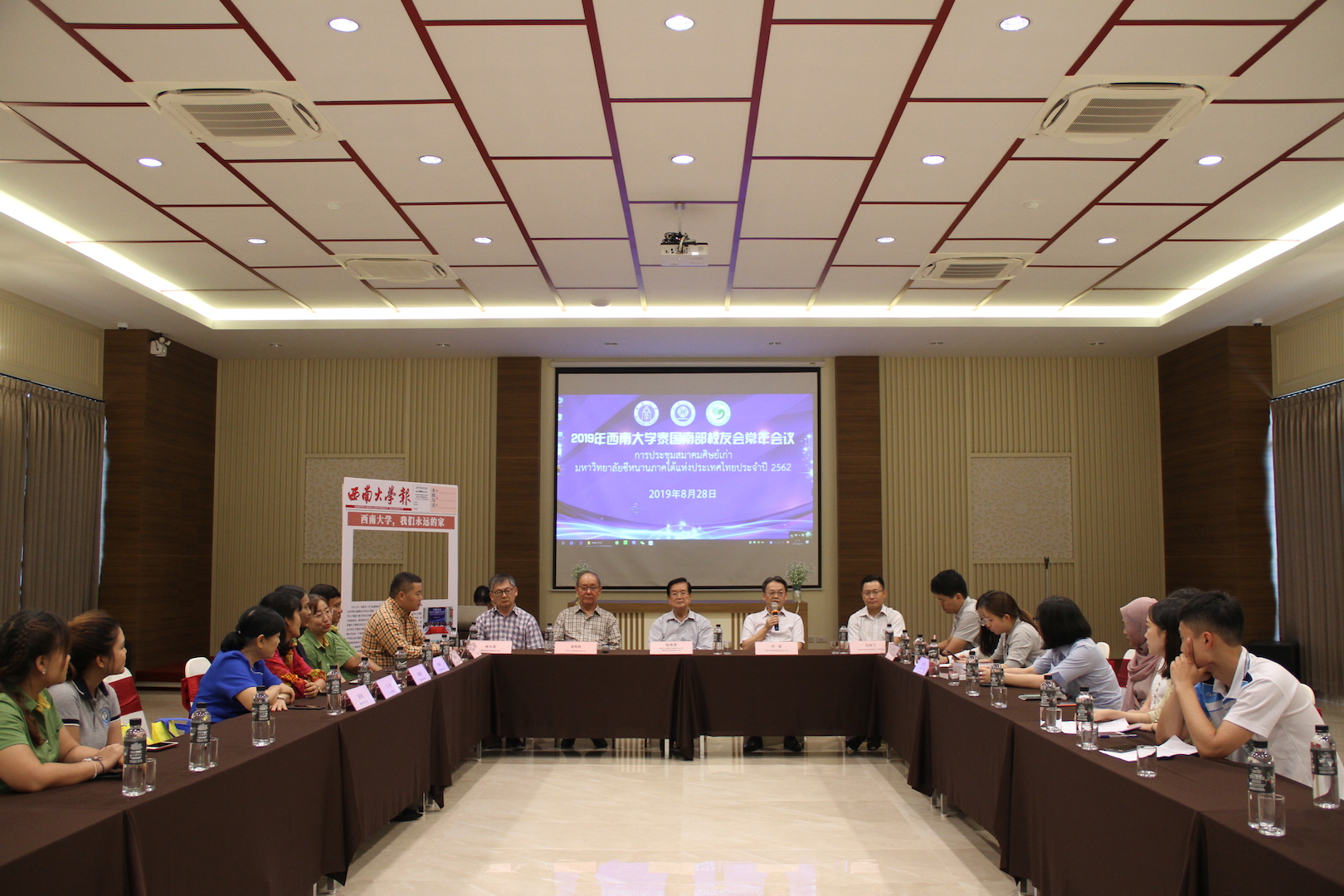 30日下午,继泰北校友会揭牌仪式之后,来自泰东北各府的30余名西大校友代表齐聚孔敬大学孔子学院含弘讲堂,召开首届校友座谈会。中国驻泰王国大使馆一等秘书宋若云 ,刘猛书记,胡琳院长等出席座谈。据初步统计,校友们来自泰国的各行各业,有政府公务员、银行职员、商人等,其中大多数是在泰从事汉语教育工作,是泰国本土汉语教师的中坚力量。