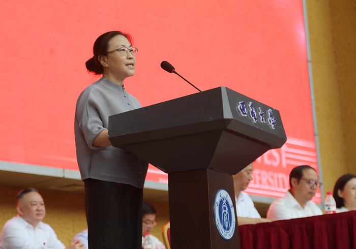 张卫国校长发表讲话,对2019级新生表示热烈欢迎,以“承西大之志,担青年之责”为题,围绕“谋民族复兴”“修君子美德”“成栋梁之才”三个奋斗坐标,深刻阐释了志与责的关系与内涵。张校长从学校的面积之大逐渐生发学生对大学和人生的思考与追寻,启迪广大学子应当追求大师之大、学术之大、能力之大、社会贡献之大,尽快融入西大,学习获得担当使命的勇气和情怀、开拓进取的境界和决心。
