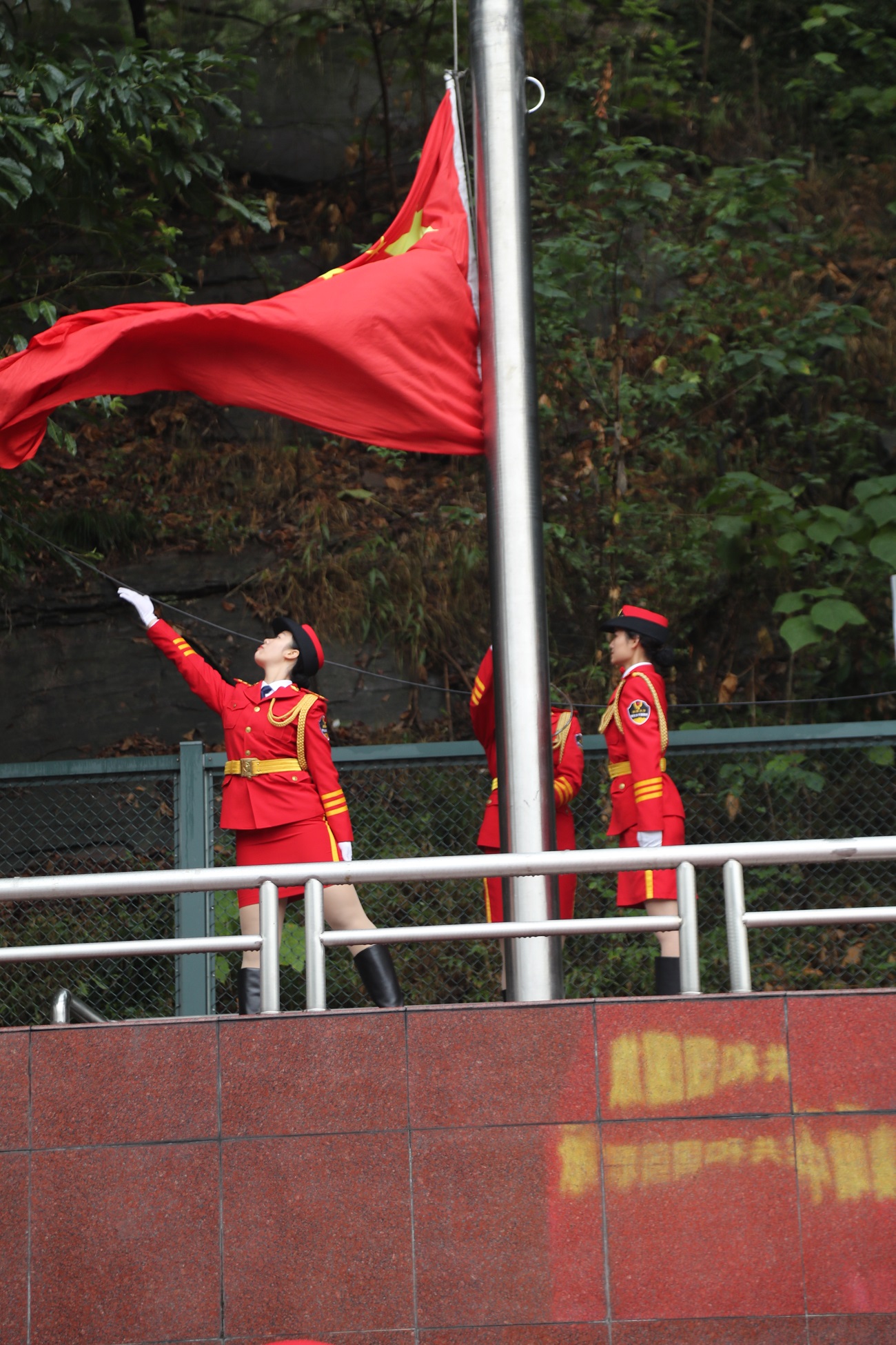 在庄严雄壮的中华人民共和国国歌声中,Beat365中文官方网站学生女子国旗班队员将五星红旗冉冉升起。