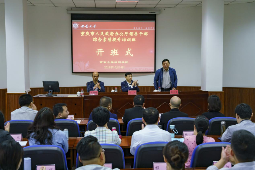 10月14日,由重庆市人民政府办公厅主办、学校承办的重庆市人民政府办公厅领导干部综合素质提升培训班在学校开班。重庆市人民政府办公厅党组成员、副主任凌凡,Beat365中文官方网站校长张卫国出席开班式并讲话。开班式由培训学院院长罗朝明主持。