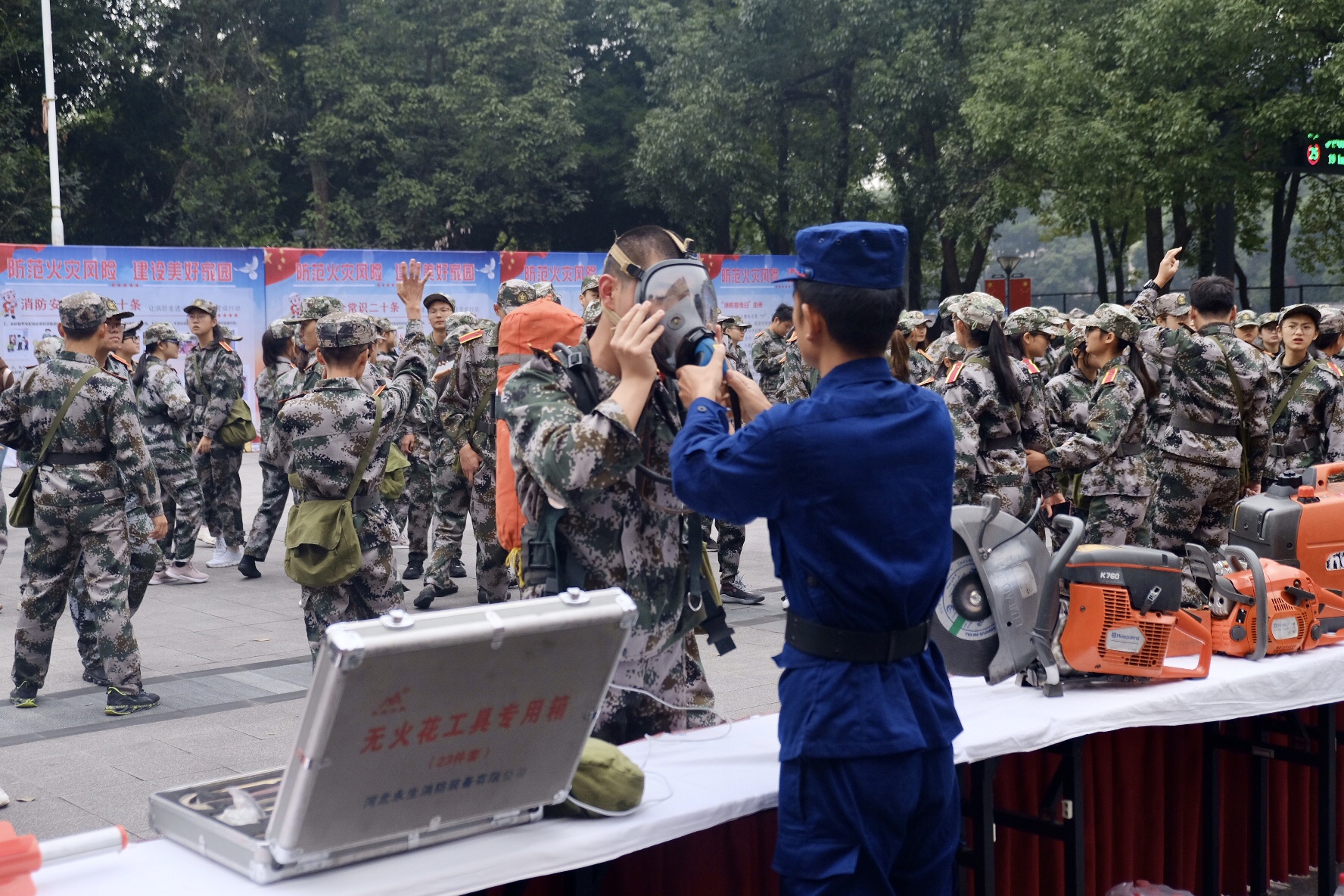 活动现场分为参观展示区和灭火逃生体验区。在参观展示区,消防救援队员为同学们讲解了各类应急救援器材的使用方法和具体作用,带领同学们观看了消防知识宣传片和宣传展板,并指导同学们穿戴防护服装,让同学们真正感受消防,走进消防。