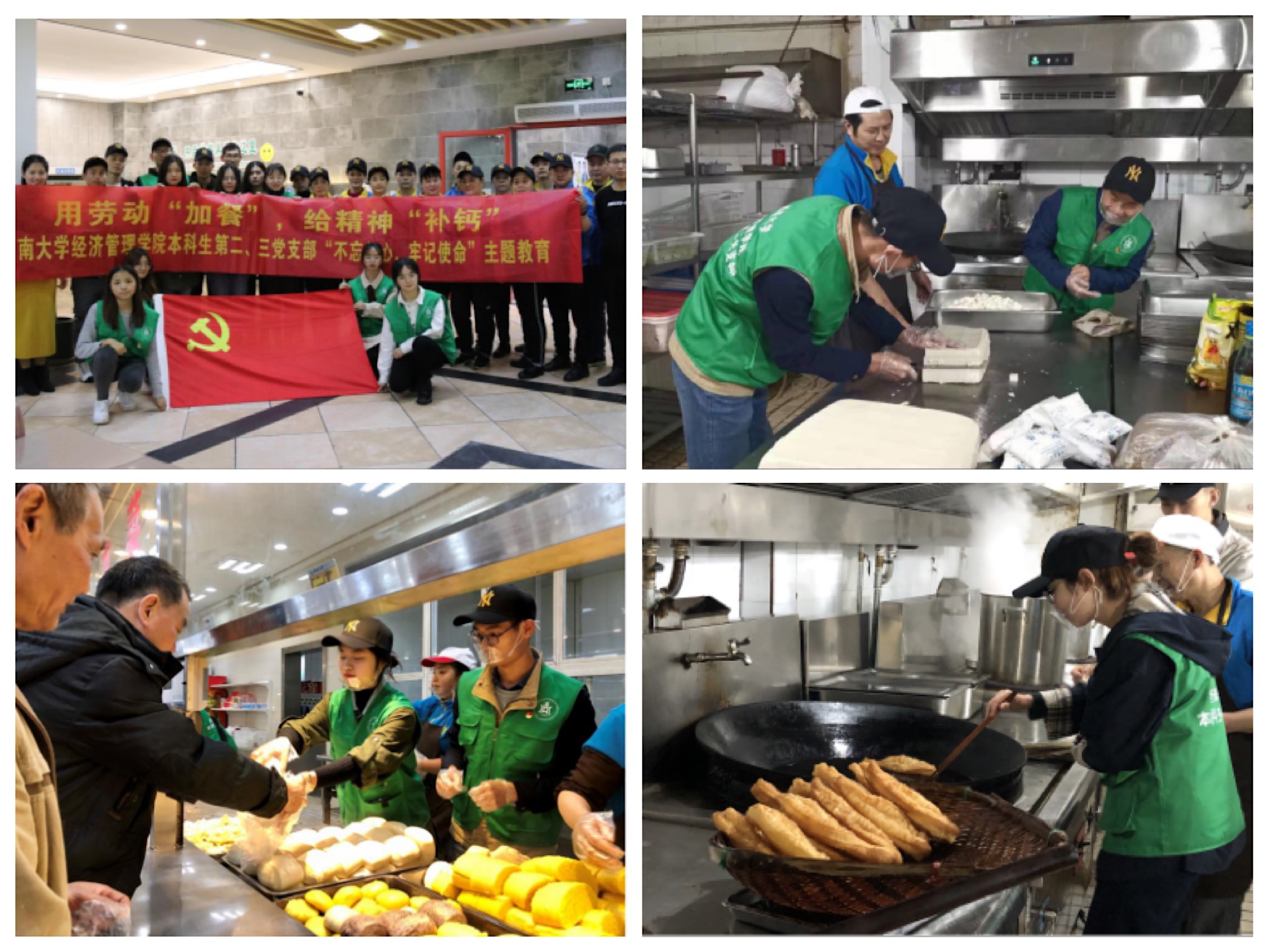 为深入开展“不忘初心、牢记使命”主题教育活动,学校经济管理学院本科生第二、三党支部深入食堂一线于开展为期两天的“用‘劳动’加餐,给‘精神’补钙”志愿服务活动。在后勤集团膳食服务中心的大力支持下,本科生第二、第三党支部的志愿者们参观了梅园米饭生产车间和橘园面点生产车间,并亲身体验了北区禾丰楼教职工食堂的饭点制作、售卖等。