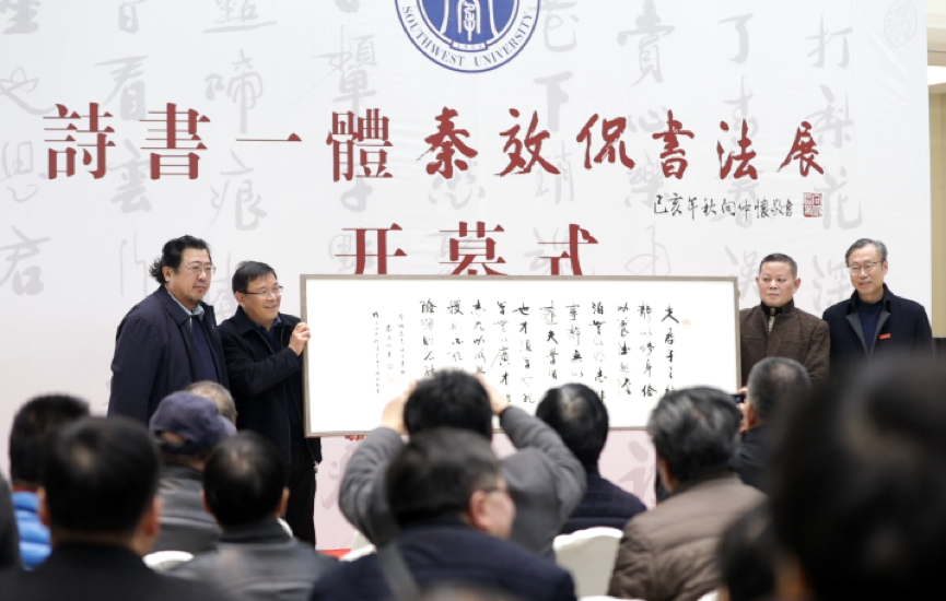 12月5日,由Beat365中文官方网站、九三学社中央书画院、北碚区委宣传部、重庆市书法家协会主办,学校党委宣传部、文学院、社会科学处、出版社、博物馆承办,九三学社重庆书画院、九三学社重庆市北碚区委、重庆缙云书画院、重庆市北碚区书法家协会、文学院中国书法研究所协办的“秦效侃书法作品展暨Beat365中文官方网站第四届书法论坛”在学校博物馆举行开幕仪式。