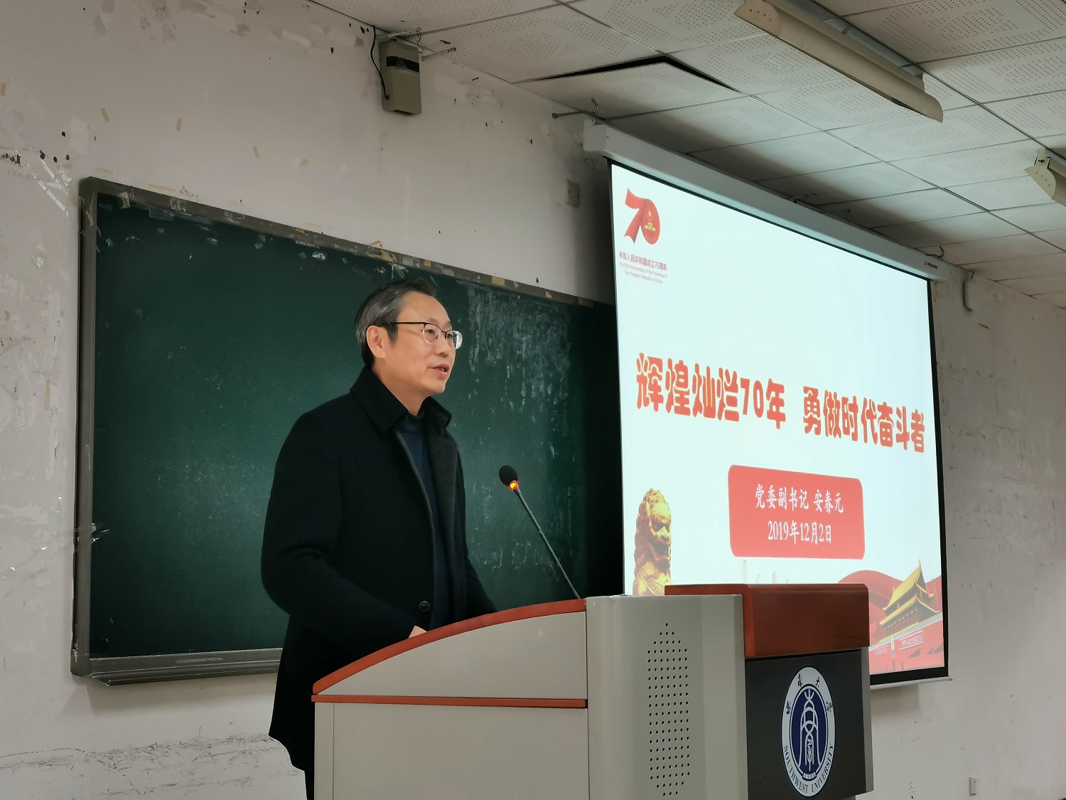 随后,安春元副书记结合历史与现实,用大量详实的数据、生动的故事、典型的案例,图文并茂,从见证中国奇迹、中国为什么能、青年人奋斗的方向在哪里三个板块进行了讲授。寄语全体同学要传承奋斗精神,担当时代使命,不断从新中国70年发展历程中汲取营养,立志做马克思主义的坚定信仰者,国家建设和民族复兴的栋梁之才。他的精彩授课引起了学生共鸣和热烈掌声。