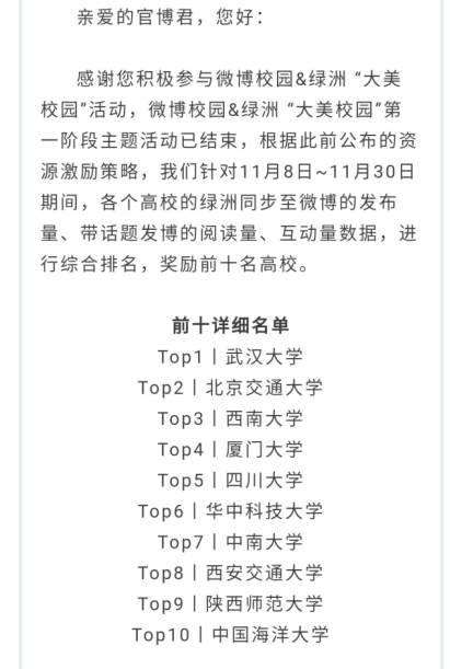 基于官方微博的优异成绩,学校受邀作为全国首批高校入驻新浪微博旗下“绿洲”APP,并以优异的表现在绿洲“大美校园”活动中取得全国高校第3名的好成绩。
