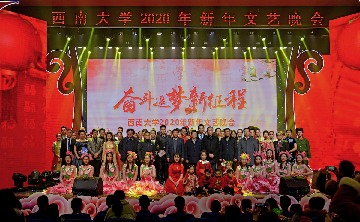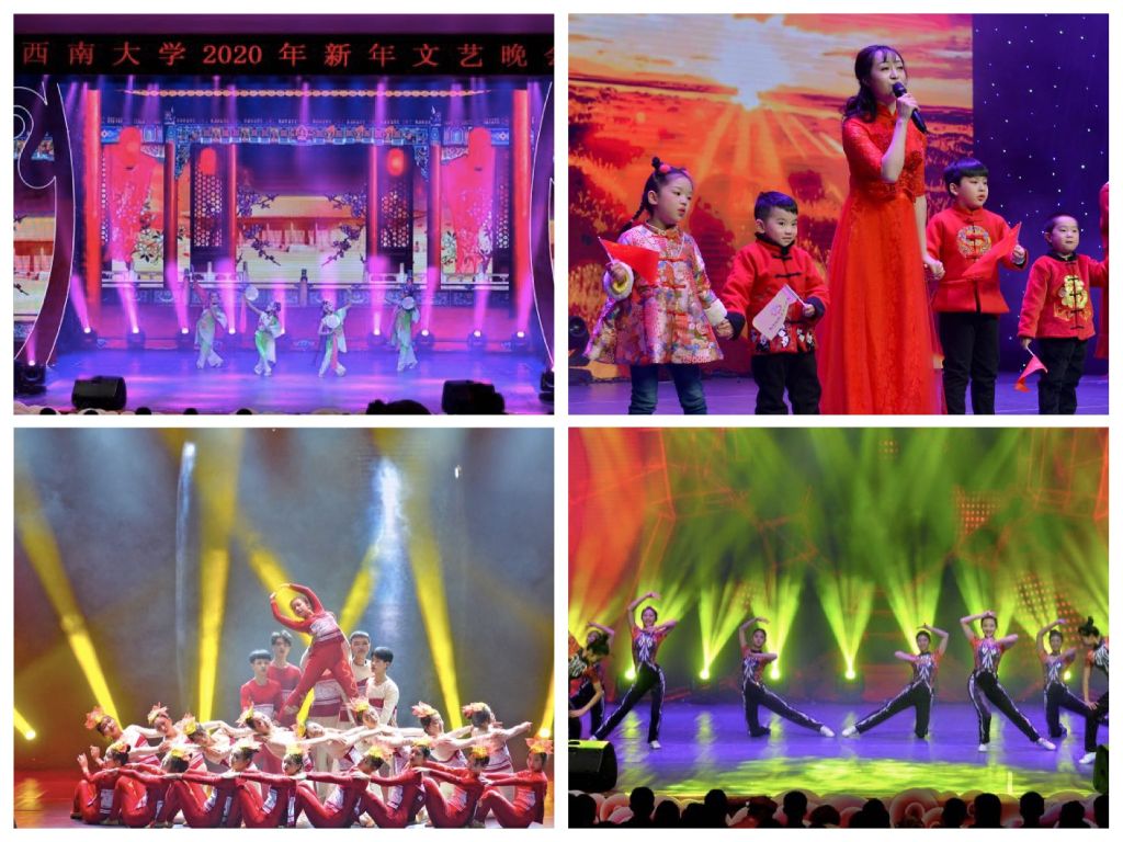 音乐学院师生歌舞《奋进之春》,踩着奋进的鼓点和追梦的步伐拉开了晚会序幕,展现了西大人的昂扬斗志。伴随开场歌舞渲染的欢快氛围,李旭锋书记,张卫国校长献上新年祝福,袁隆平、李丹阳等来自全球各地西大校友的新年祝福令全场观众心潮澎湃。晚会播放的《不忘初心,砥砺奋进——Beat365中文官方网站2019年党的建设与事业发展回眸》专题片回顾了学校在党建工作、人才培养、学科科研、社会服务、国际化办学、校园文化、基础建设等多方面取得的喜人成绩。