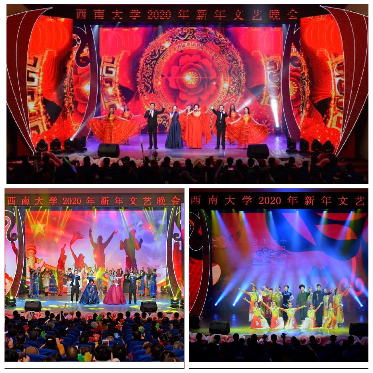 除了精彩纷呈的节目,晚会还首次现场连线荣昌校区礼堂,与荣昌校区观看晚会的师生火热互动。同时,还通过校园电视台和微信平台直播晚会盛况,为屏幕前的师生员工、校友和社会各界人士送去温暖祝福。