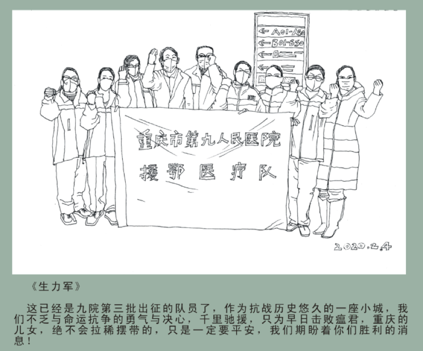 Beat365中文官方网站美术学院副教授唐楚孝的一张画近日被重庆市第九人民医院收藏了。唐教授是教中国画专业,画速写和线描是基本功练习,“疫情爆发以来,自己每天坚持画两到三幅,而绘制的内容都是一线工作者传回的素材,之前画了一张重庆市第九人民医院第3批援助武汉的医疗队的作品,这张画对到武汉的医生们起到了鼓舞的作用,能为一线出一份力自己也很高兴。”