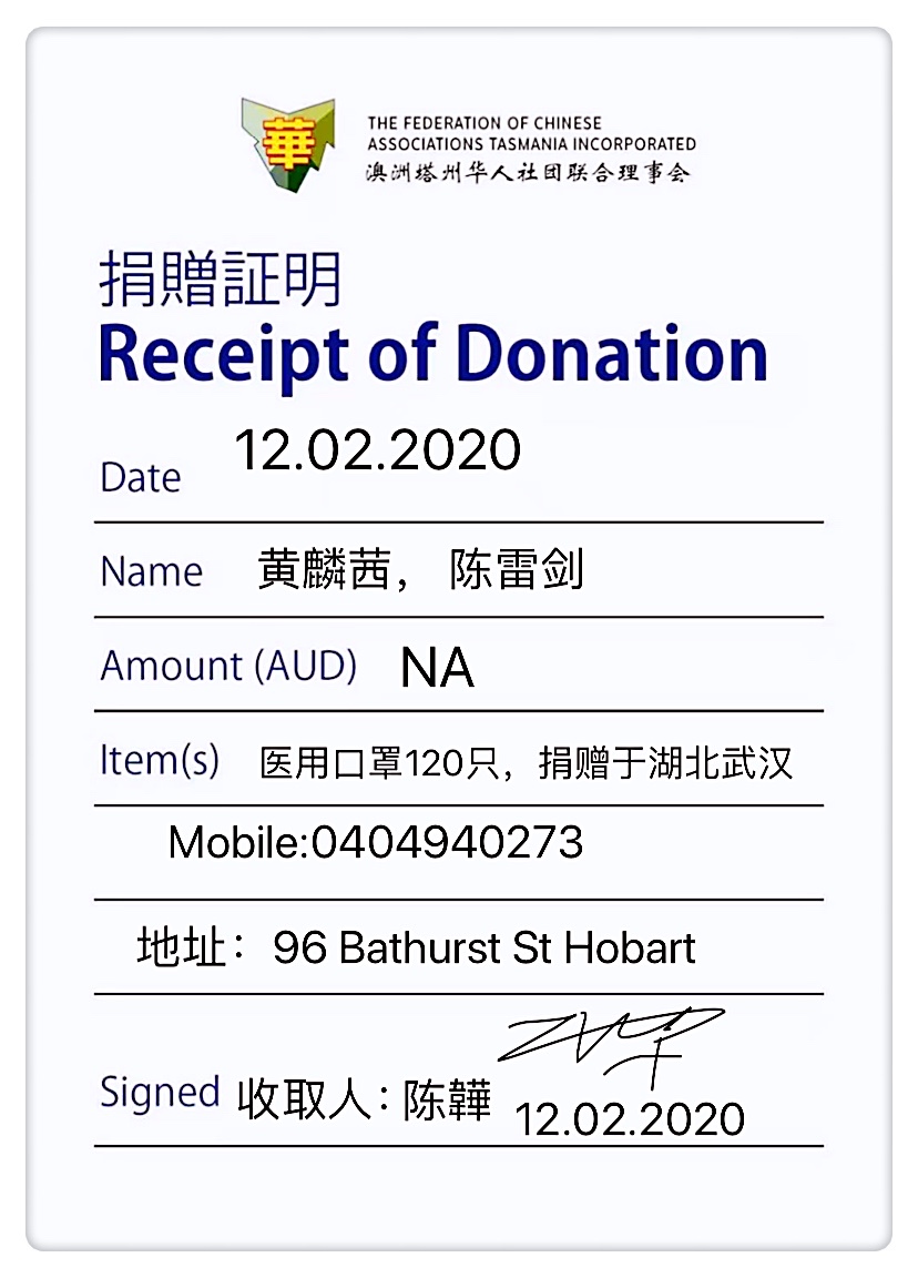 “寻找”口罩的过程非常的艰辛,两位同学跑了十几家药均全部断货,在快要失望的时候终于在一家商店“抢”到了120只宝贵的医用口罩。之后他们又陆陆续续跑更远的药店,最后发现确实买不到口罩了。为了将口罩及时顺利送达武汉,两位同学煞费苦心。在看到澳洲塔州华人社团联合理事会发起支援祖国抗击肺炎疫情的募捐倡议后,两位同学马上联系协会副会长委托其将120个口罩统一寄回祖国,他们悬着的心才最终放下来。