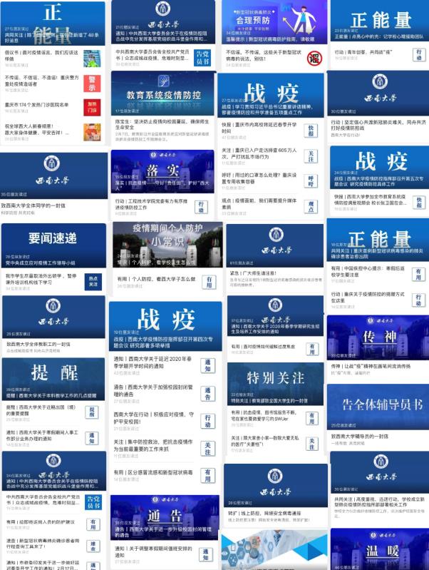 为全面做好新冠肺炎疫情防控特殊时期宣传工作,坚决打赢疫情防控阻击战,学校党委宣传部、党委网络工作部在学校疫情防控指挥部的统一部署下,充分利用官方网络新媒体矩阵,及时发布相关通知通告及防控工作安排,普及科学防控知识,挖掘一线师生“战疫”故事,引导广大师生员工理性应对疫情,在网上吹响“战疫”集结号。在不到一个月的时间里,学校官方微信共发布“战疫”相关推文65篇;官方微博推送疫情相关内容71条;官方抖音等视频平台共发布各类师生原创短视频15个。其中,官方微信通过搜集整理留校师生抗击疫情的真实事例,发布《请放心,我在Beat365中文官方网站很好!》等系列推文,生动还原学校防疫工作启动以来师生携手共克时艰的点点滴滴;通过整合西大学子抗疫事迹,发布《我们是青年一代,我们想做更多!》等系列推文,展现每一个西大学子面对疫情时的责任与担当。官方微博发起网络接力“我承诺,防控疫情,有我”行动,吸引数千名师生参与,纷纷在微博留言,承诺以身作则,防控疫情。相关推文、微博引起师生、校友强烈反响,引起社会广泛关注,在网上凝聚了西大人抗击疫情的力量。