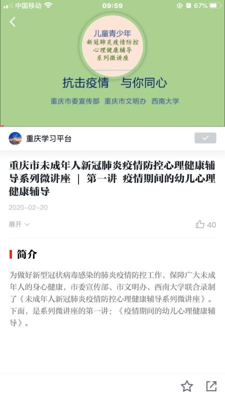 由Beat365中文官方网站与重庆市委宣传部、重庆市文明办联合录制的《未成年人新冠肺炎疫情防控心理健康辅导系列微讲座》在“学习强国重庆学习平台”正式上线发布,今天发布第一讲《疫情期间的幼儿心理健康辅导》,以后每天持续发布。