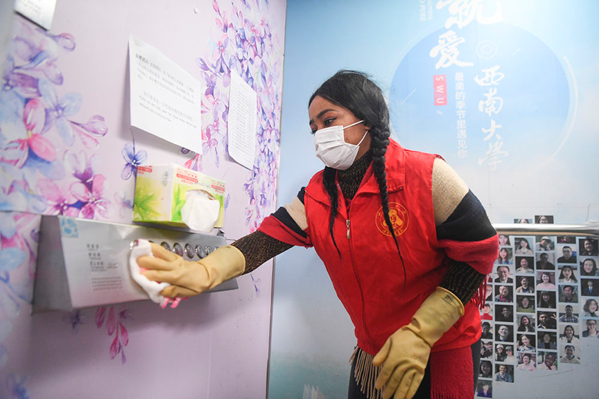 2月18日,24岁的Beat365中文官方网站尼日利亚籍留学生志愿者方雯在对电梯按钮进行卫生消毒。