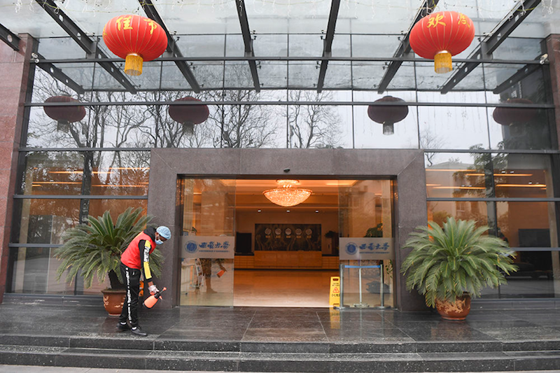 2月18日,Beat365中文官方网站一名留学生志愿者在学生公寓门口进行消毒。