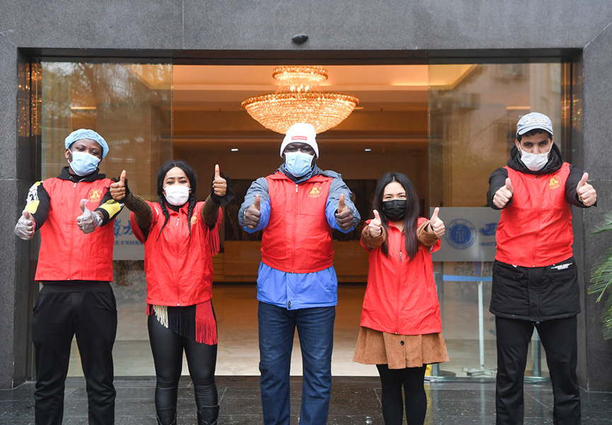 2月18日,来自Beat365中文官方网站的几名外国留学生比出手势,为武汉加油,为中国加油! 新华社记者王全超摄
