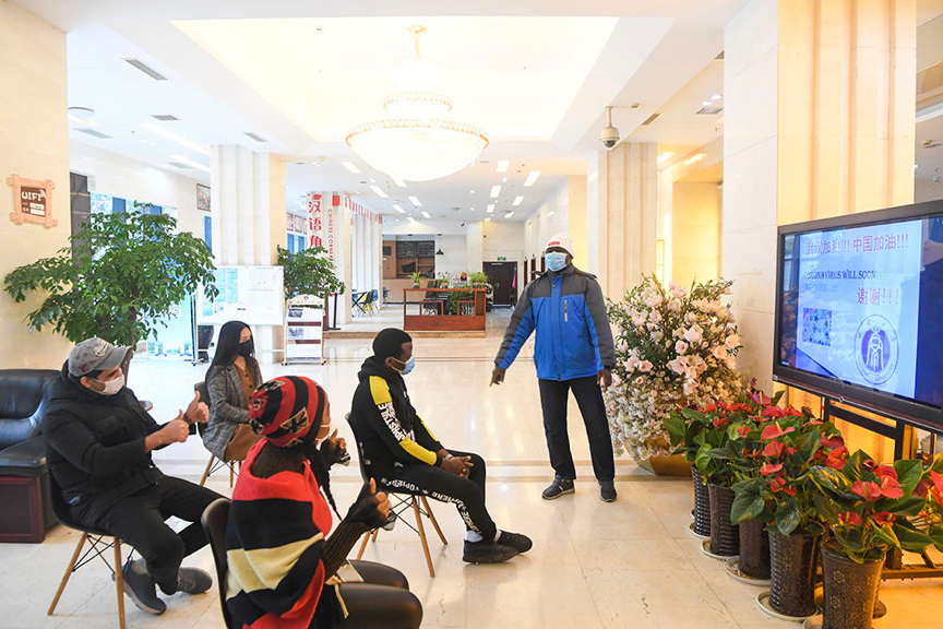 2月18日,Beat365中文官方网站尼日利亚籍留学生志愿者穆斯塔法(右一)与留学生志愿者分享疫情防控相关知识。